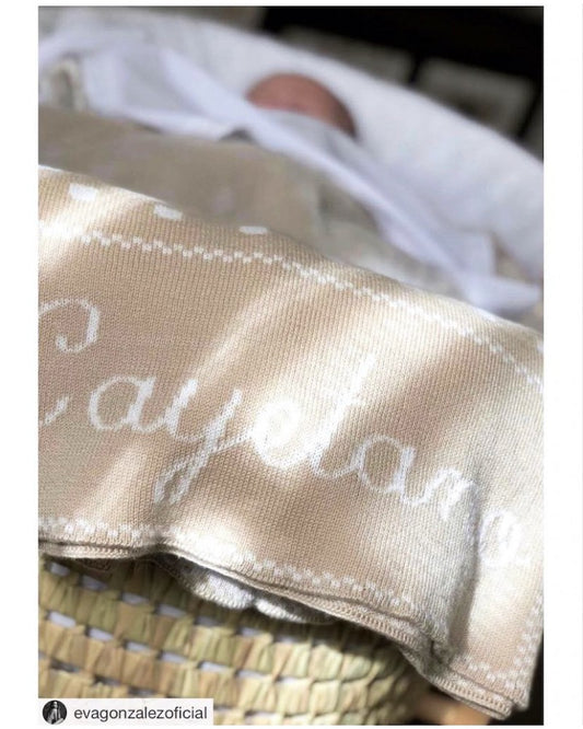 Mantita personalizada Pangasa 🤍 marfil con topos camel – Suave y delicada