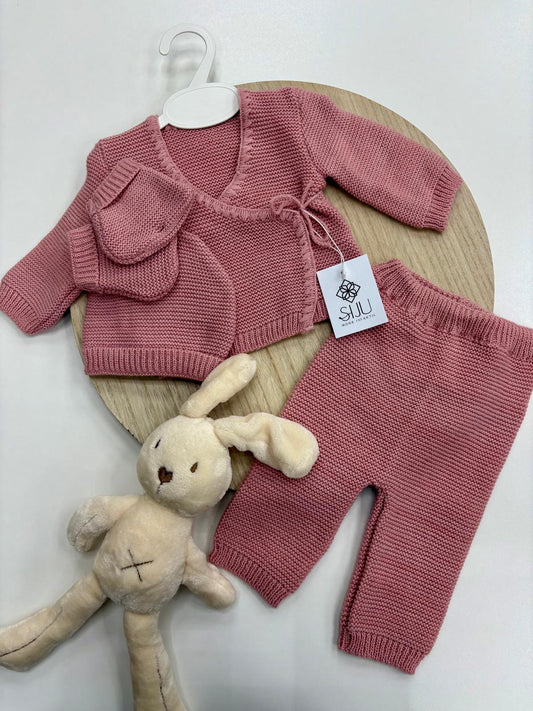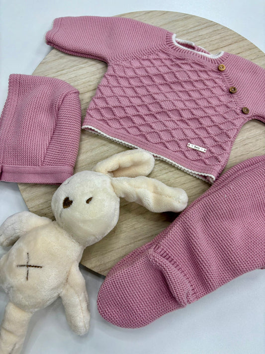 Conjunto primera puesta bebé 3 piezas rosa empolvado con capota y botones laterales – 00 prematuro a 6 meses
