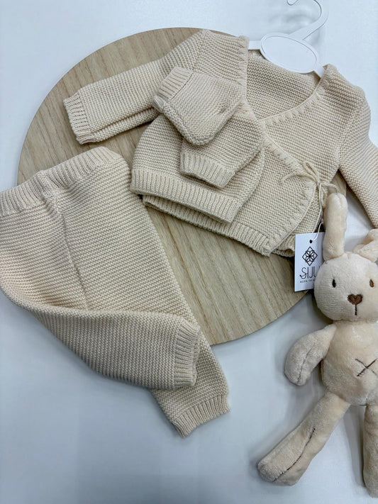 Conjunto Primera Puesta Bebé Arena | Peto Cruzado con Lazo, Gorro y Manoplas 0-6 meses