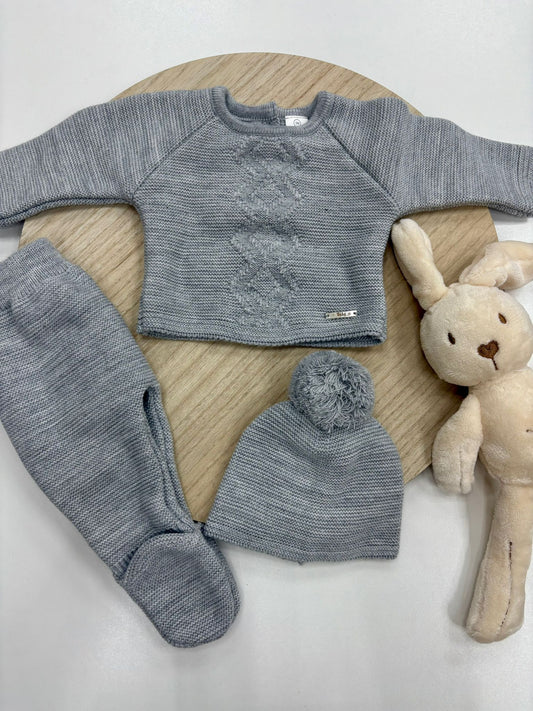 Conjunto primera puesta bebé 3 piezas gris – jersey con dibujo de rombos y gorro con pompón – 00 prematuro a 6 meses