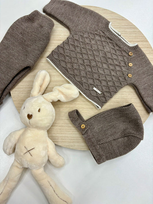 Conjunto primera puesta bebé 3 piezas crudo – jersey con dibujo de rombos y gorro con pompón – 00 prematuro a 6 meses