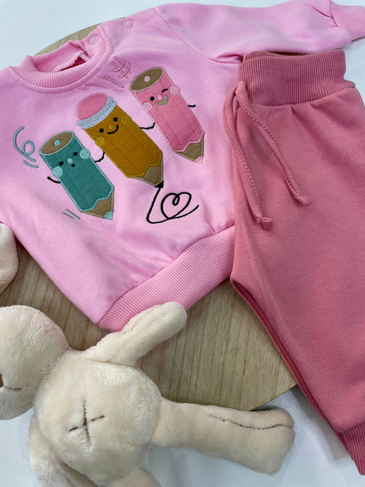Chándal bebé niña rosa con dibujo de lápices y forro interior suave | 6-48M