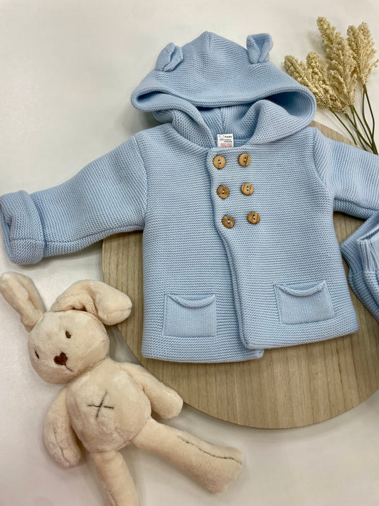 Conjunto Chaqueta y Polaina de Lana para Bebé – Celeste con Capucha y Orejitas (3-12 meses) 🐻💙