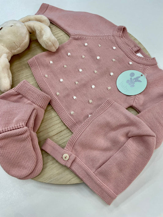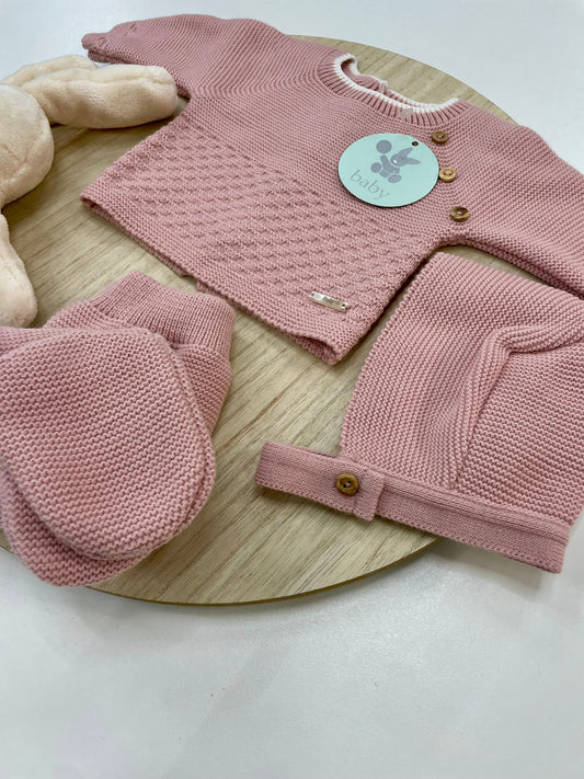 Conjunto Polaina Caricia Rosa Empolvado 3 piezas recién nacido 00-6 meses | Primera puesta bebé