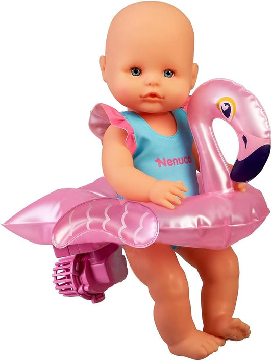 Nenuco - ¡Hora de Nadar!, muñeco bebé Nadador, con un Flotador de Flamenco con Motor Que le Hace Girar en la bañera y Piscina, Juguete Resistente al Agua para la Hora del baño