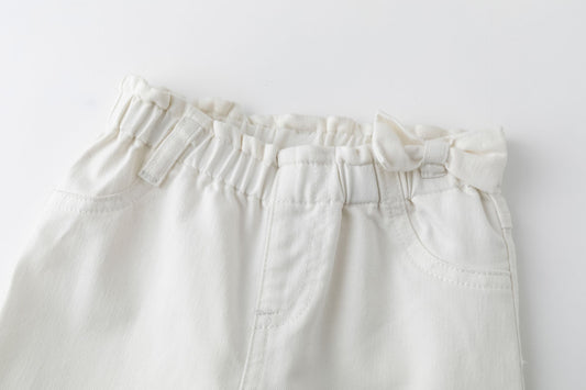 Pantalón vaquero largo de bebé niña, de cinco bolsillos, y cintura alta de goma. Prenda color blanco.