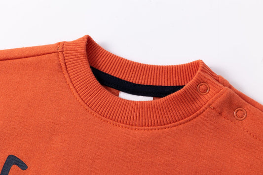 Sudadera de bebe niño, cuello caja y hombros caídos. Graficos de texto estampado al agua con detalles el relieve. Etiqueta decorativa. Abertura de corchetes en hombro.