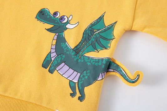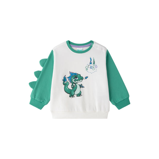 Sudadera de bebe niño, cuello caja y hombros caídos. Felpa perchada. Gráfico imitando bolsillo frontal y de dragón estampado al agua, con cola en 3D. Etiqueta decorativa. Abertura de corchetes en hombro.