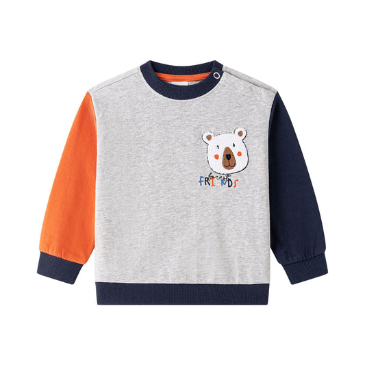 Sudadera de bebe niño, cuello caja y hombros caídos. Felpa de rizo. Mangas y cuello con color a contraste. Abertura de corchetes en hombro.