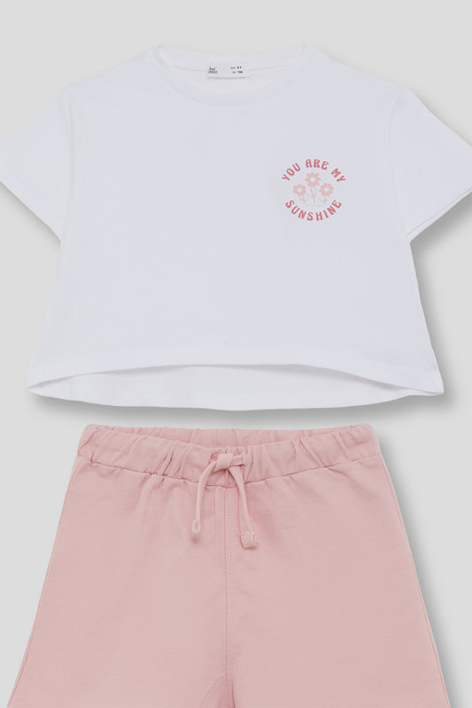 Conjunto de niña Street Mockey camiseta blanca y short coral | Algodón 2-16 años