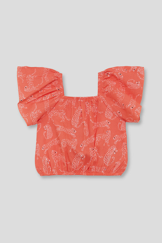 Top de niña Street Mockey coral estampado con mangas fruncidas 2-16 años