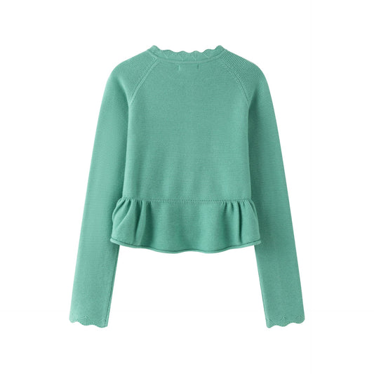 Blusa tejido estampado de flores de niña. Manga larga con goma elástica en el interior de los puños. Dos volantes verticales en el delantero. Abertura con botón de plástico en espalda.
