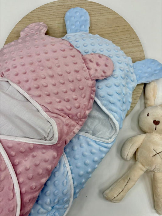 Saco para carro o silla de paseo minky topitos con capucha osito | Rosa empolvado o celeste