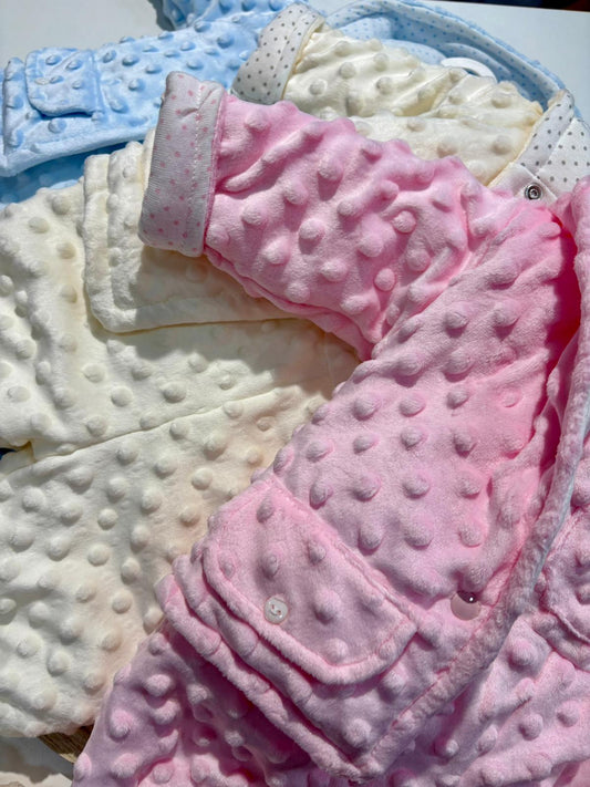Conjunto bebé 3 piezas minky con chaqueta, peto y camiseta blanca | Colores celeste, rosa y crudo | Tallas 3, 6 y 12 meses