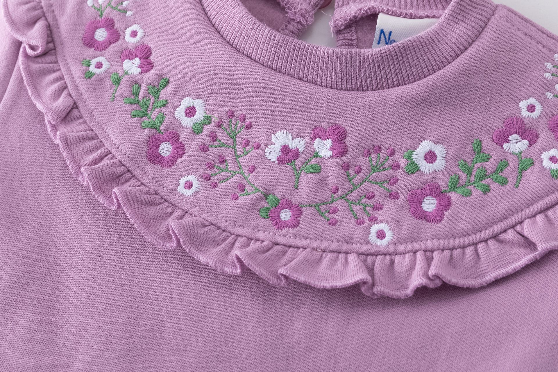 👕 Sudadera afelpada con volante a tono en el cuello y delicadas flores bordadas 🌸.