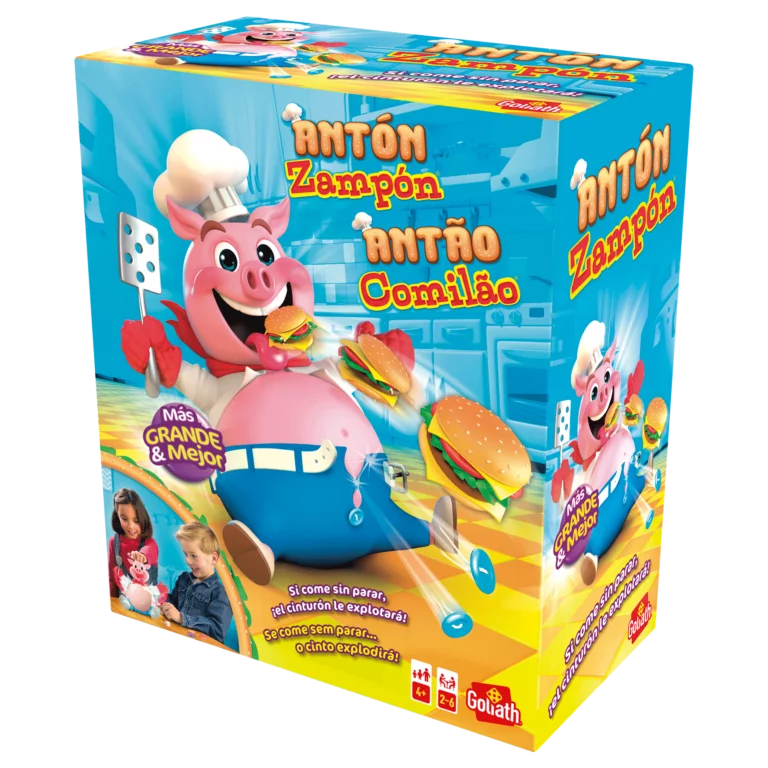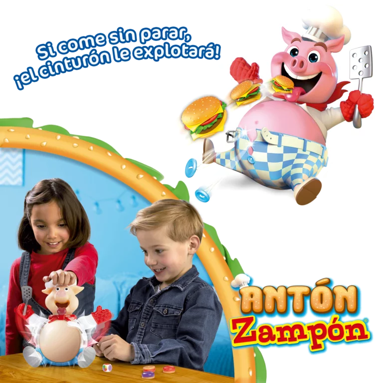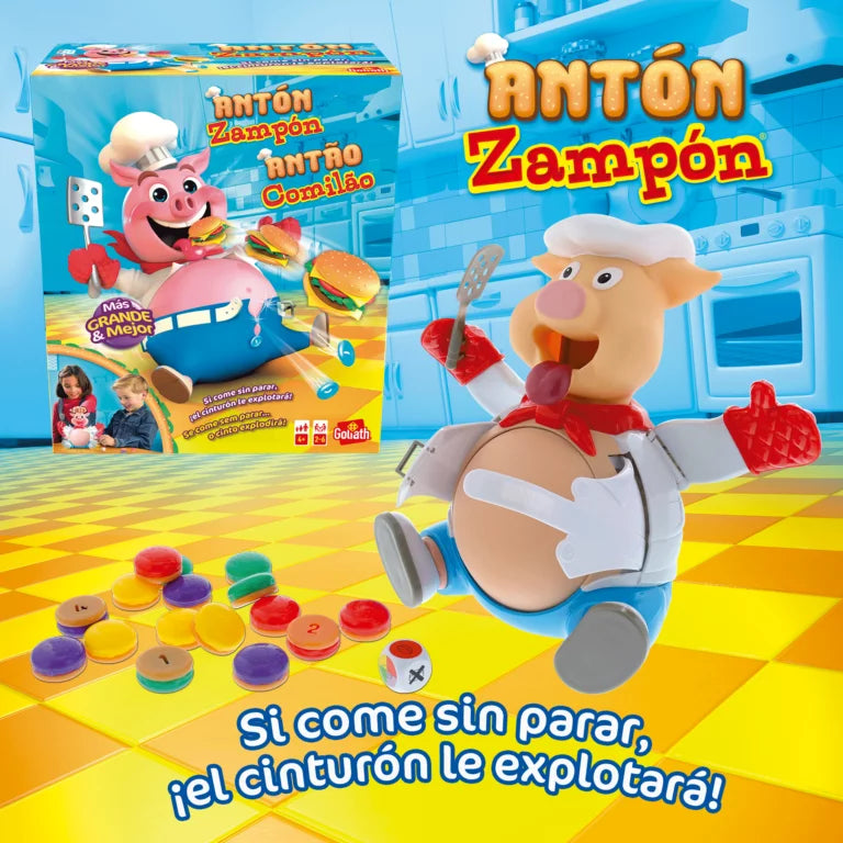 Antón Zampón es el rey de las hamburguesas y siempre tiene hambre. Tira el dado y coge la hamburguesa de ese color. La hamburguesa te dirá cuantas veces tienes que presionar su cabeza para ayudarle a comer esa jugosa hamburguesa. Pero ¡cuidado! porque a medida que va masticando verás como su barriga se empieza a hinchar y a hinchar. Si en tu turno, de repente, sus brazos se abren y el cinturón ¡plaf! explota, ¡mala suerte! has perdido la partida.