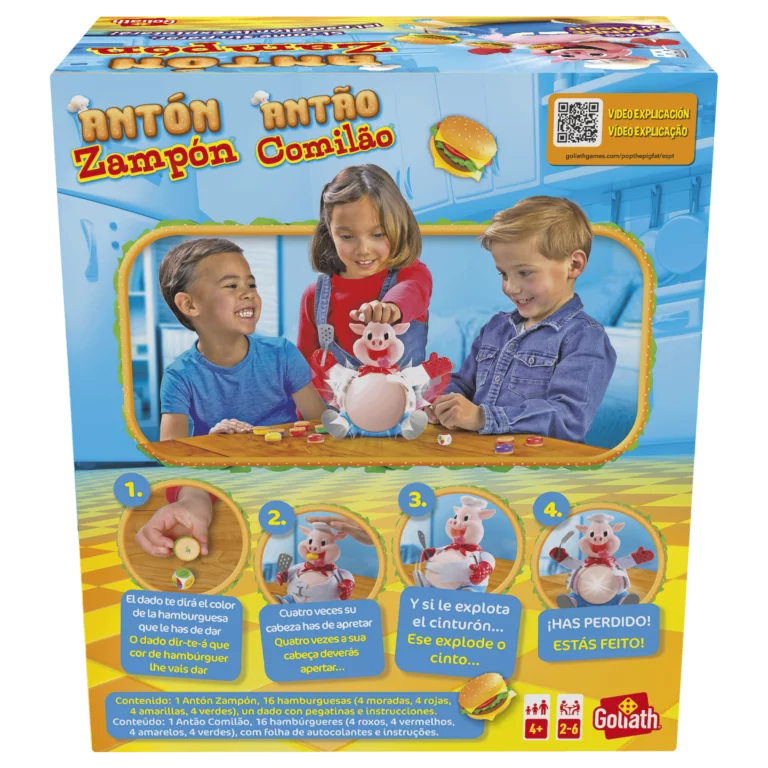 Contenido: Cerdito Antón Zampón, 16 hamburguesas de 4 colores distintos, un dado con hoja de pegatinas e instrucciones.