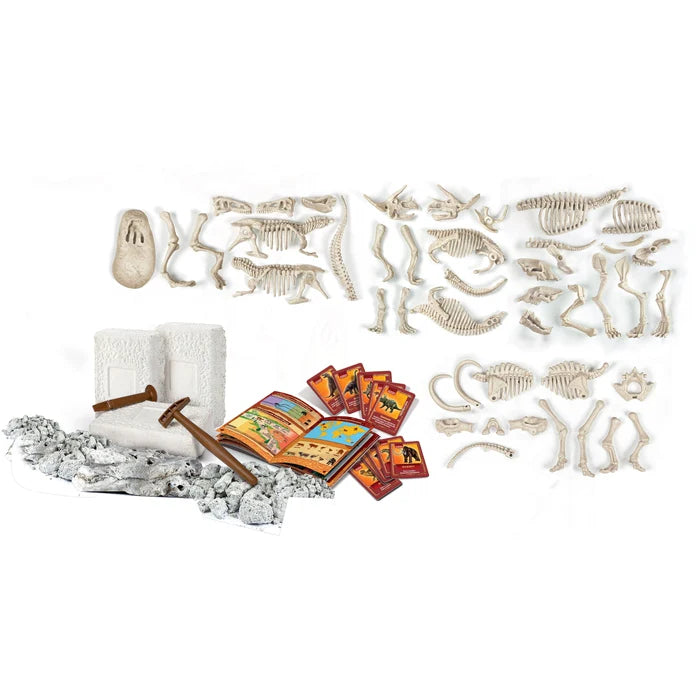 Este completo kit científico permite excavar bloques de tierra y desenterrar los esqueletos fosforescentes de dos dinosaurios —el temible T-Rex y el robusto Triceratops— junto a dos animales prehistóricos: el Mamut y el Smilodon.