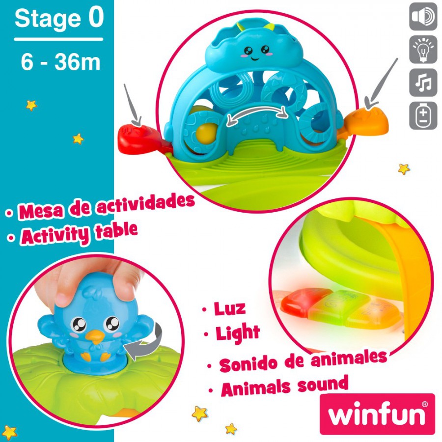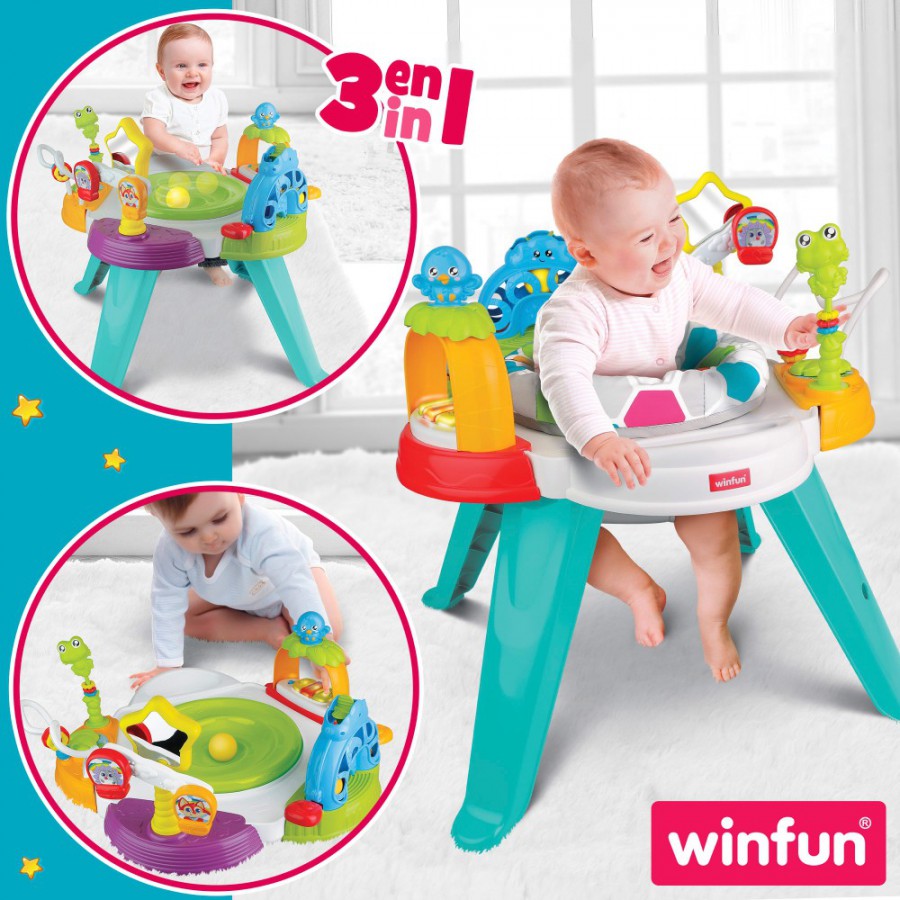 ¡Disfruta, juega y ríe con el centro de actividades Winfun! Mesa de actividades para divertirse dentro o fuera de ella, coloca el asiento del bebé para que pueda jugar con seguridad desde dentro o coloca la tapa y añade una actividad más junto al sonajero de ranita y el laberinto de cuentas; la noria giratoria y el espejo; el divertido juego de bolas o el pajarito giratoria con las teclas de números luminosas.