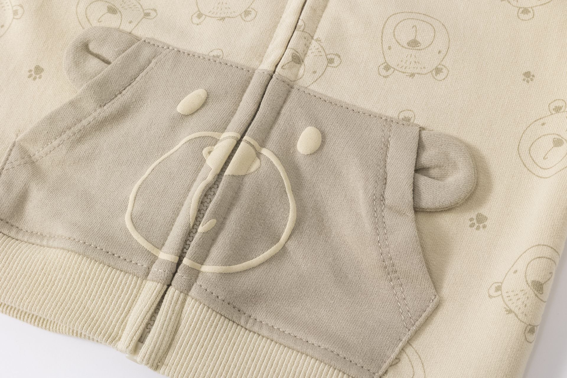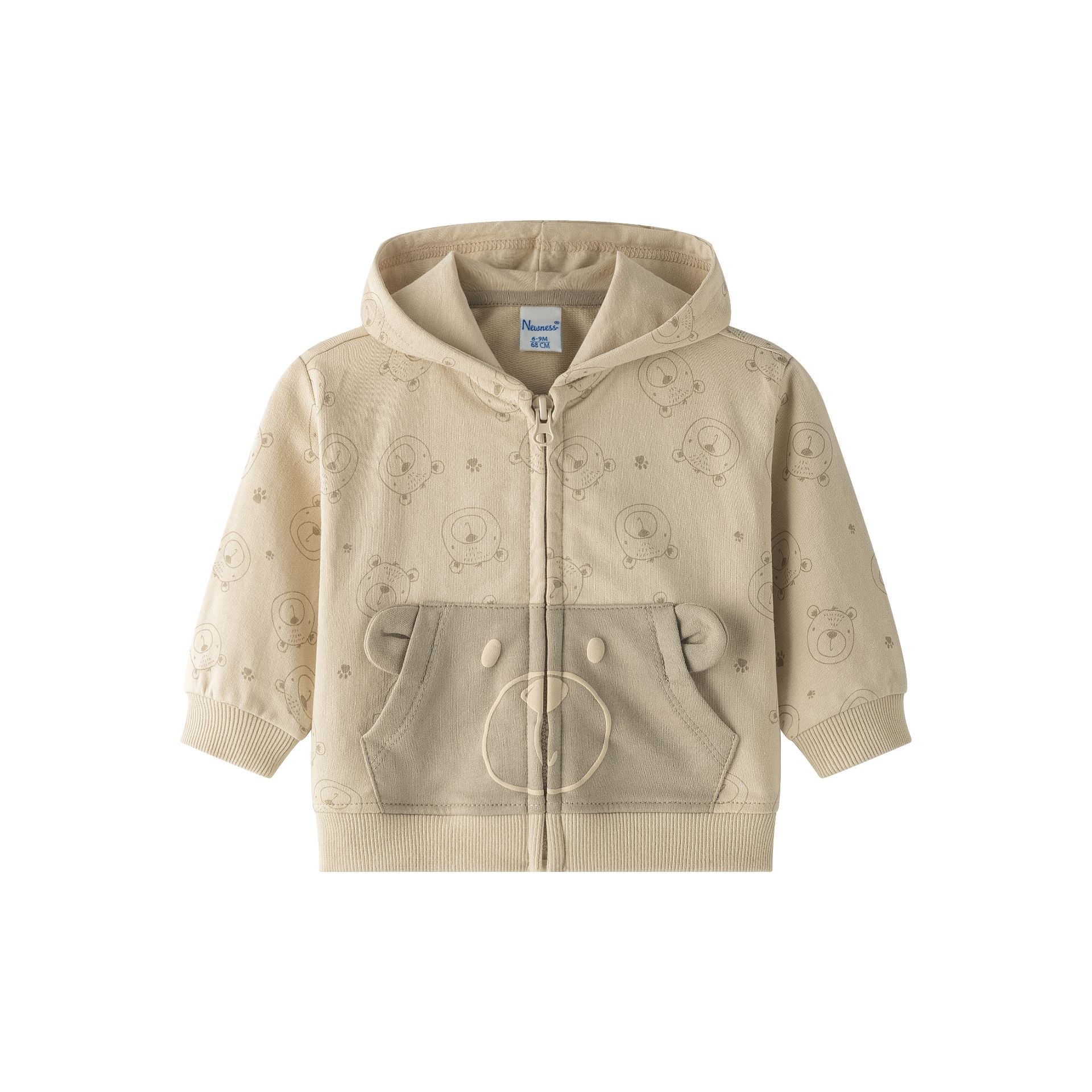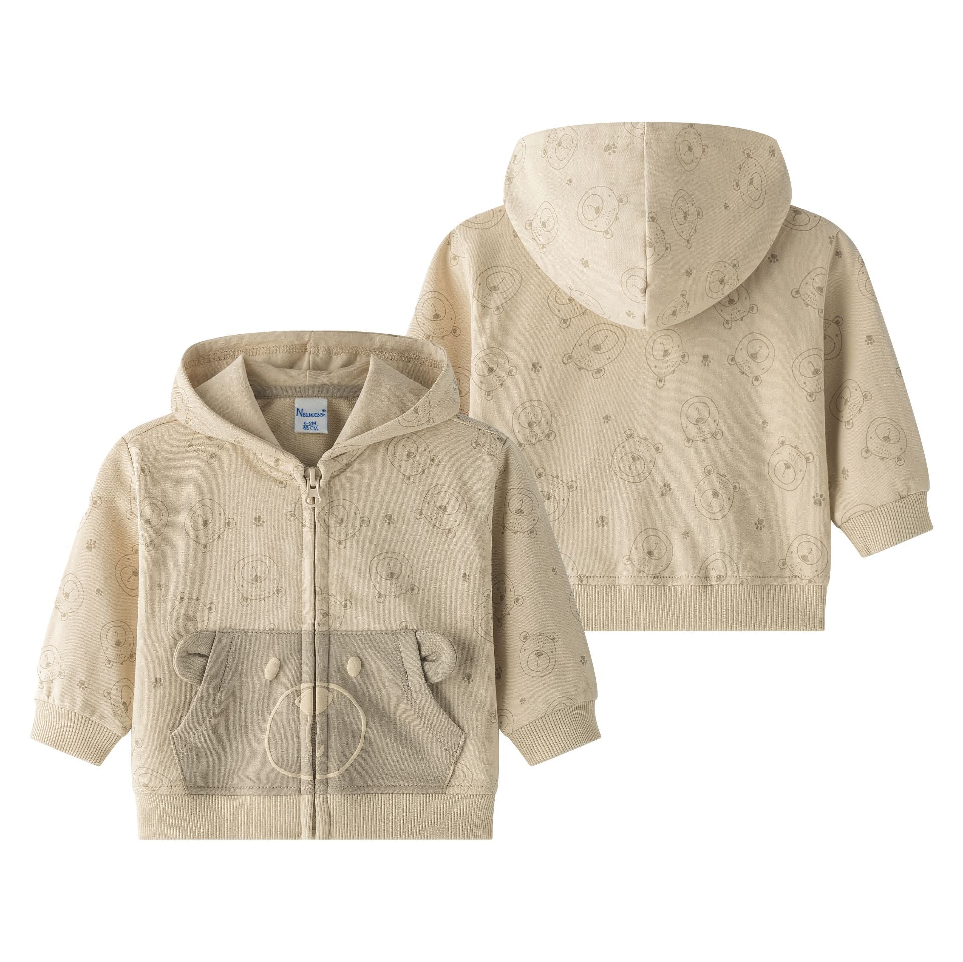 Chaqueta de bebé niño con capucha, manga larga y cierre delantero con cremallera, perfecta para los días fresquitos 🍂. En color camel, destaca por sus divertidos bolsillos delanteros en forma de osito 🐻 que aportan un toque tierno y original. Confeccionada en 100% algodón para garantizar suavidad y comodidad en la piel del bebé. Disponible en tallas de 6 a 24 meses, es una prenda práctica y adorable para el día a día. 💕