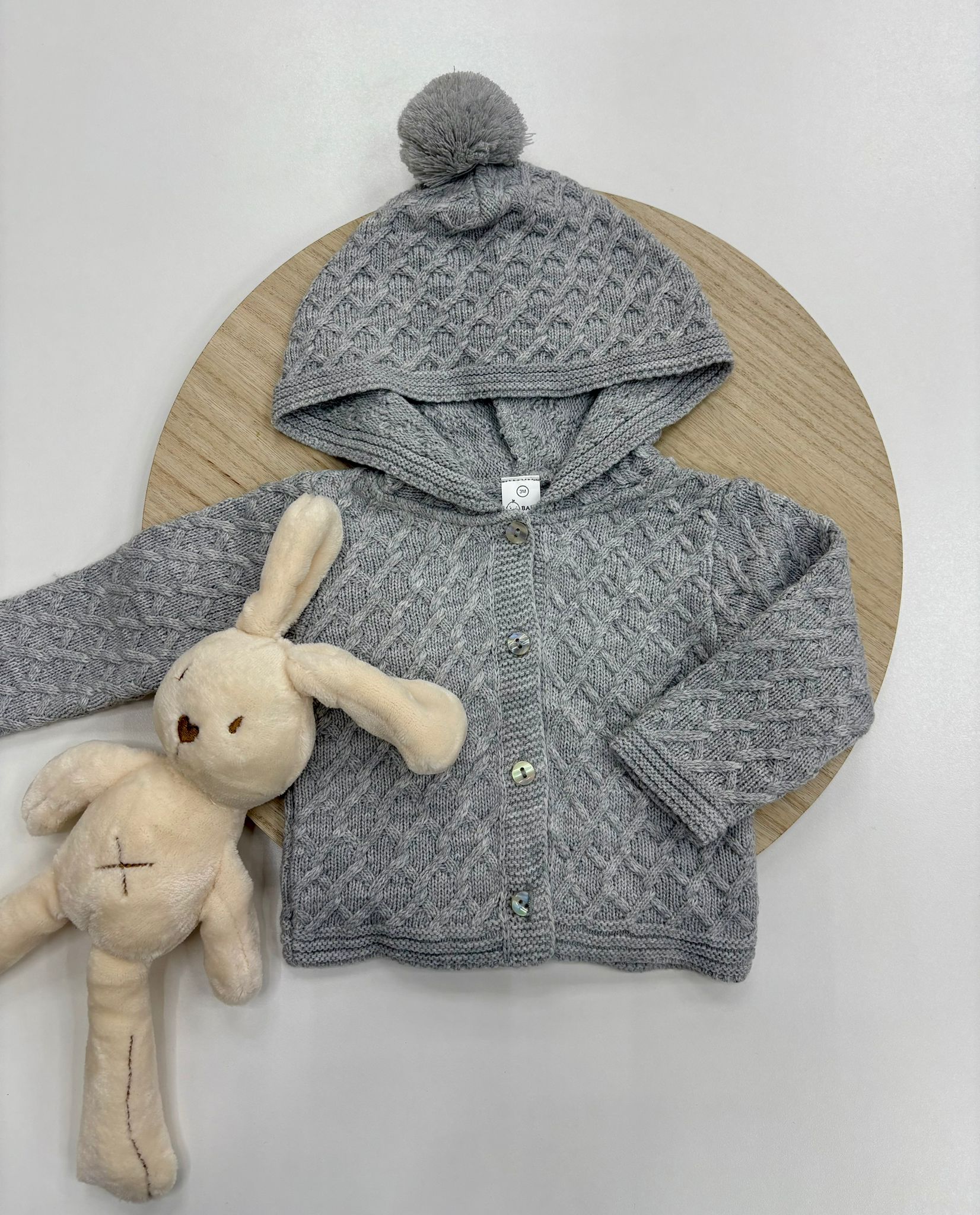 Una prenda imprescindible para los días fríos, con el equilibrio perfecto entre abrigo y estilo. Esta chaqueta de punto para bebé en color gris está confeccionada en lana acrílica suave, ofreciendo máxima comodidad y un toque clásico ideal para cualquier ocasión.