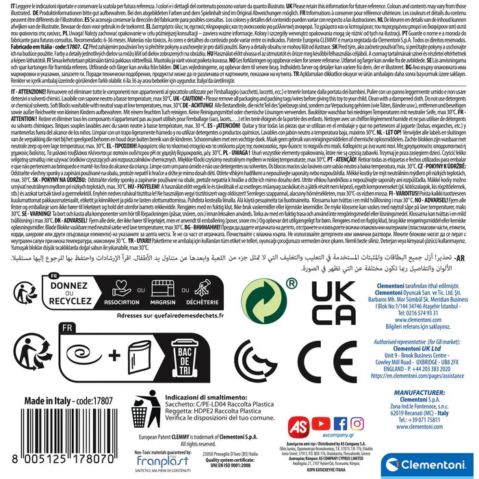 Incluye 15 bloques blanditos Clemmy, perfectos para manipular, apilar, encajar y explorar con total seguridad gracias a su textura suave y sus colores vivos.