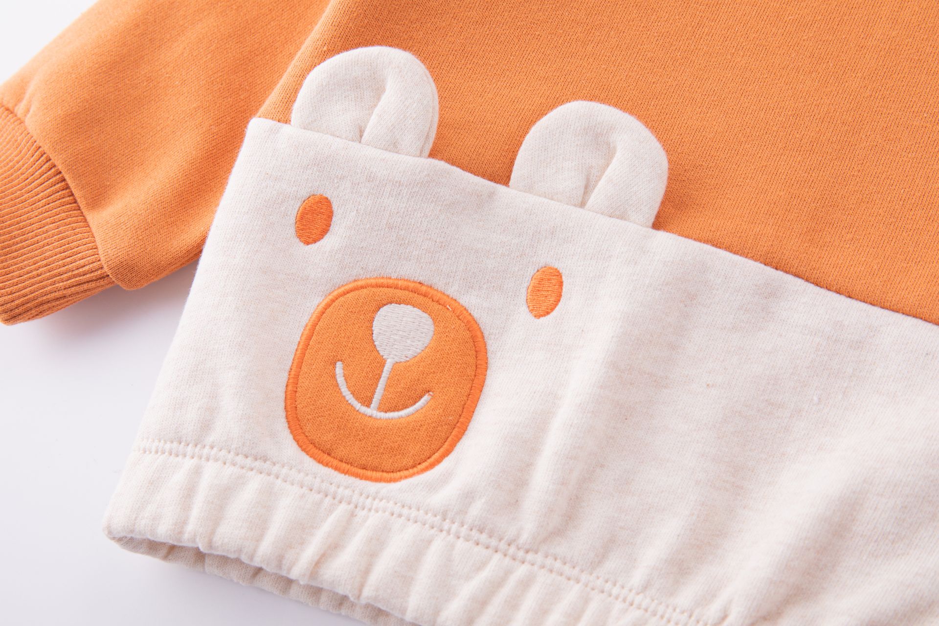 Un conjunto lleno de dulzura para tu peque ✨. Incluye una sudadera de manga larga en felpa naranja, con cuello a la caja, botones en el hombro y un encantador estampado de osito 🐻. El pantalón largo afelpado perchado completa el look, con cintura elástica y un simpático osito estampado en la parte trasera. Fabricado en 80% algodón y 20% poliéster, es suave, cómodo y calentito, ideal para bebés de 6 a 24 meses. Perfecto para el día a día y para presumir de estilo adorable. 💕
