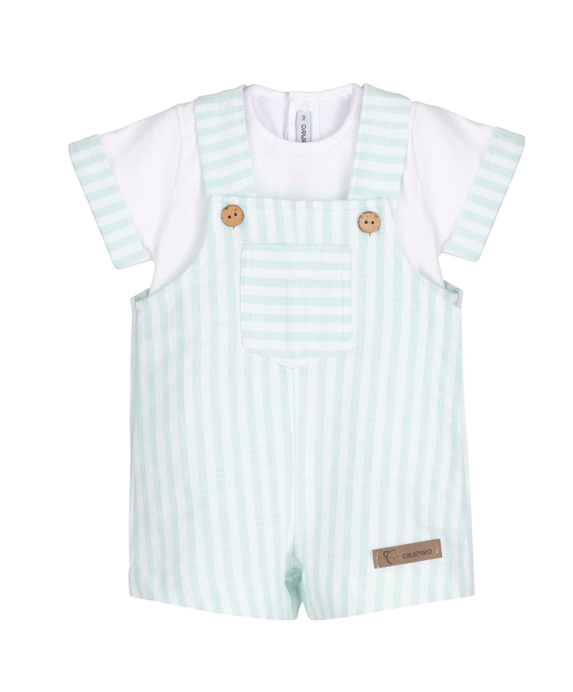 Un conjunto fresco y cómodo formado por camiseta blanca de manga corta y peto de rayas en tono mint, con un diseño dulce y atemporal perfecto para el día a día o para ocasiones especiales.