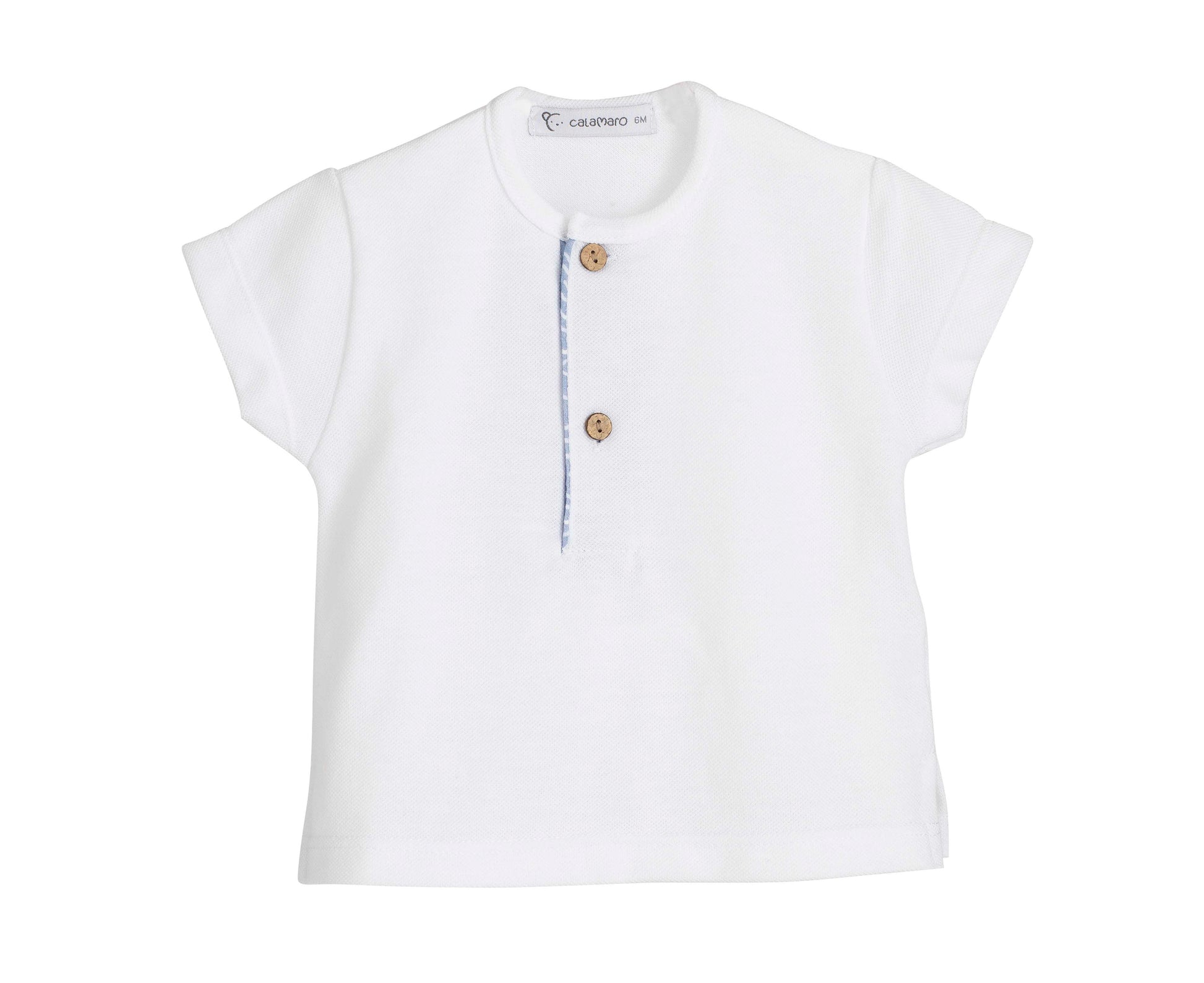 Conjunto de dos piezas de la familia Sikar de Calamaro, ideal tanto para bebé como para niño, perfecto para los días de verano por su tejido ligero y cómodo. Un diseño fresco y atemporal que combina camiseta blanca con detalle de botones y short estampado en tono azul con dibujo ondulado, creando un look elegante y actual.