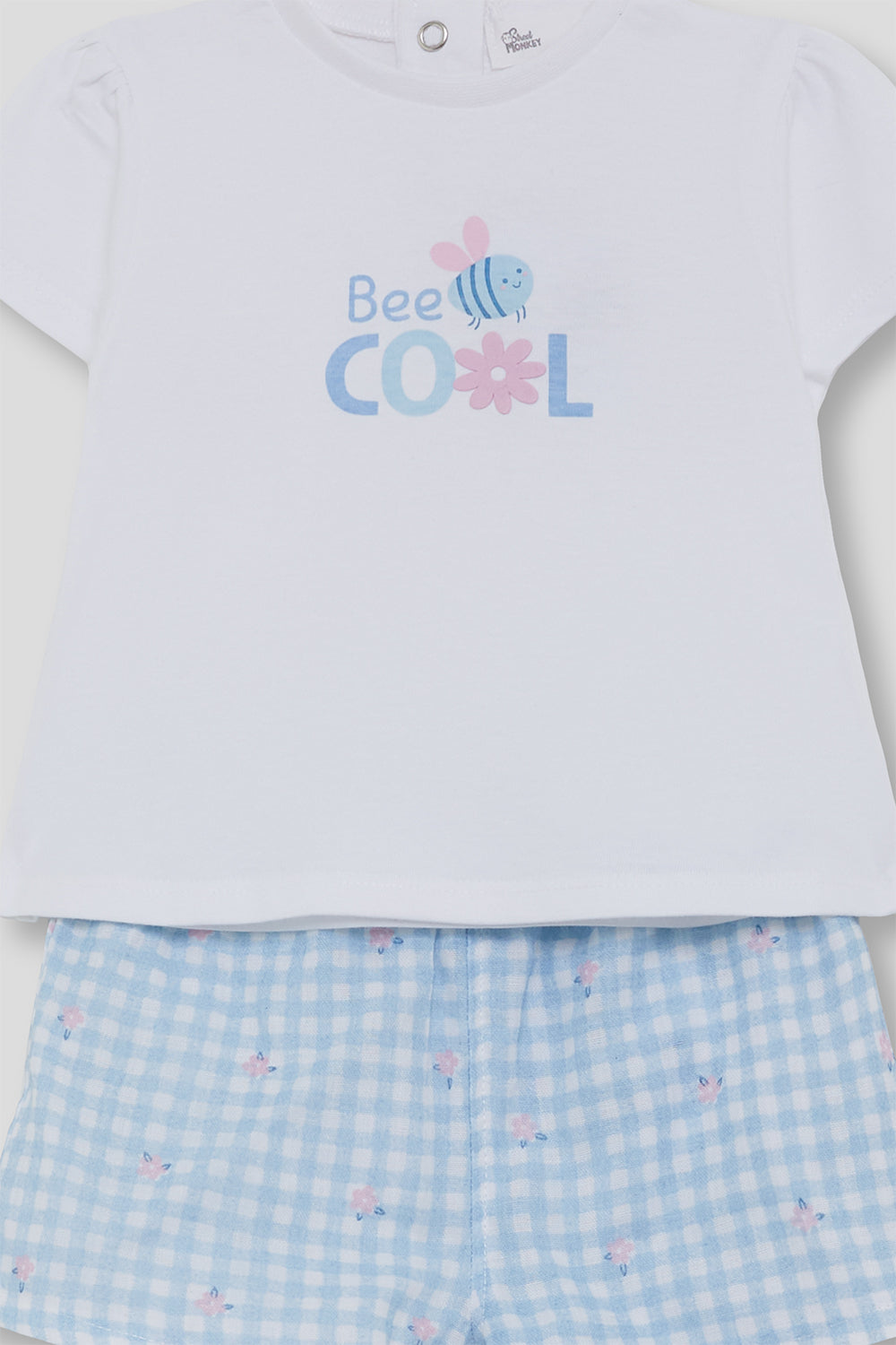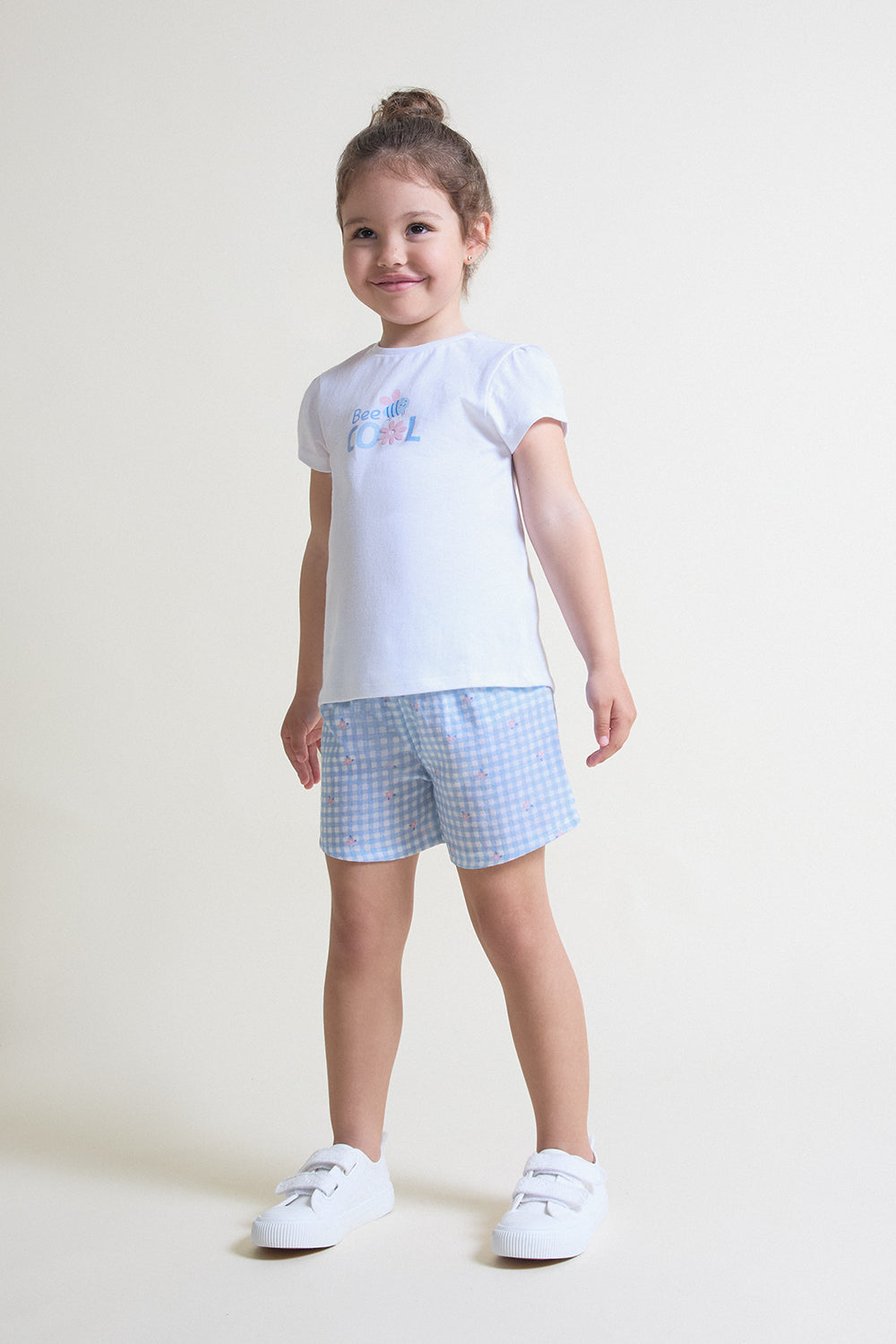 Conjunto infantil para niña confeccionado en algodón suave y transpirable, ideal para el uso diario durante los meses de calor. La camiseta blanca de manga corta presenta un delicado estampado frontal “Bee Cool”, aportando un toque alegre y veraniego, además de un corte cómodo que facilita el movimiento.
