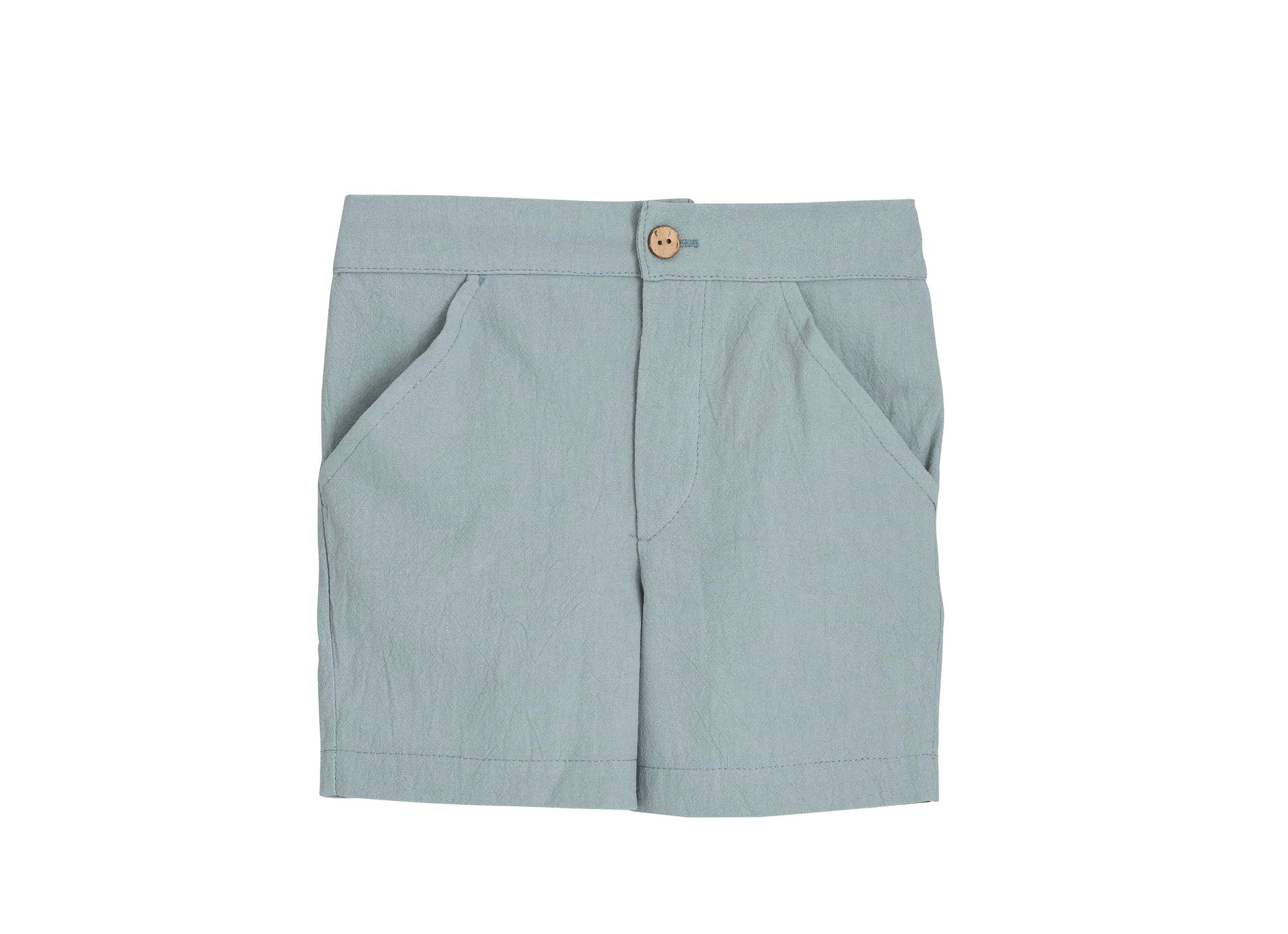La camisa de manga corta presenta un delicado estampado de cuadros finos en tonos suaves, con cuello mao y botonadura frontal, aportando un aire elegante y actual. Se combina con un pantalón corto en tono verde agua, con bolsillos laterales y cinturilla cómoda, perfecto para el uso diario o eventos especiales.