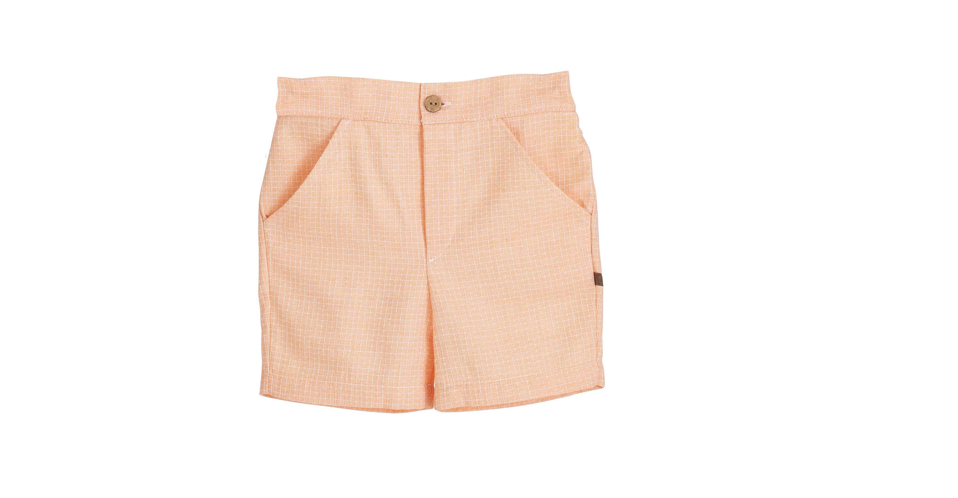 Conjunto de niño de la familia Delhi de la marca Calamaro, ideal para los días más especiales del verano. Está formado por un polo blanco de manga corta, con cuello clásico y botones delanteros, combinado con un pantalón corto en tono melocotón con delicado dibujo de cuadritos, creando un conjunto fresco, elegante y muy cómodo.