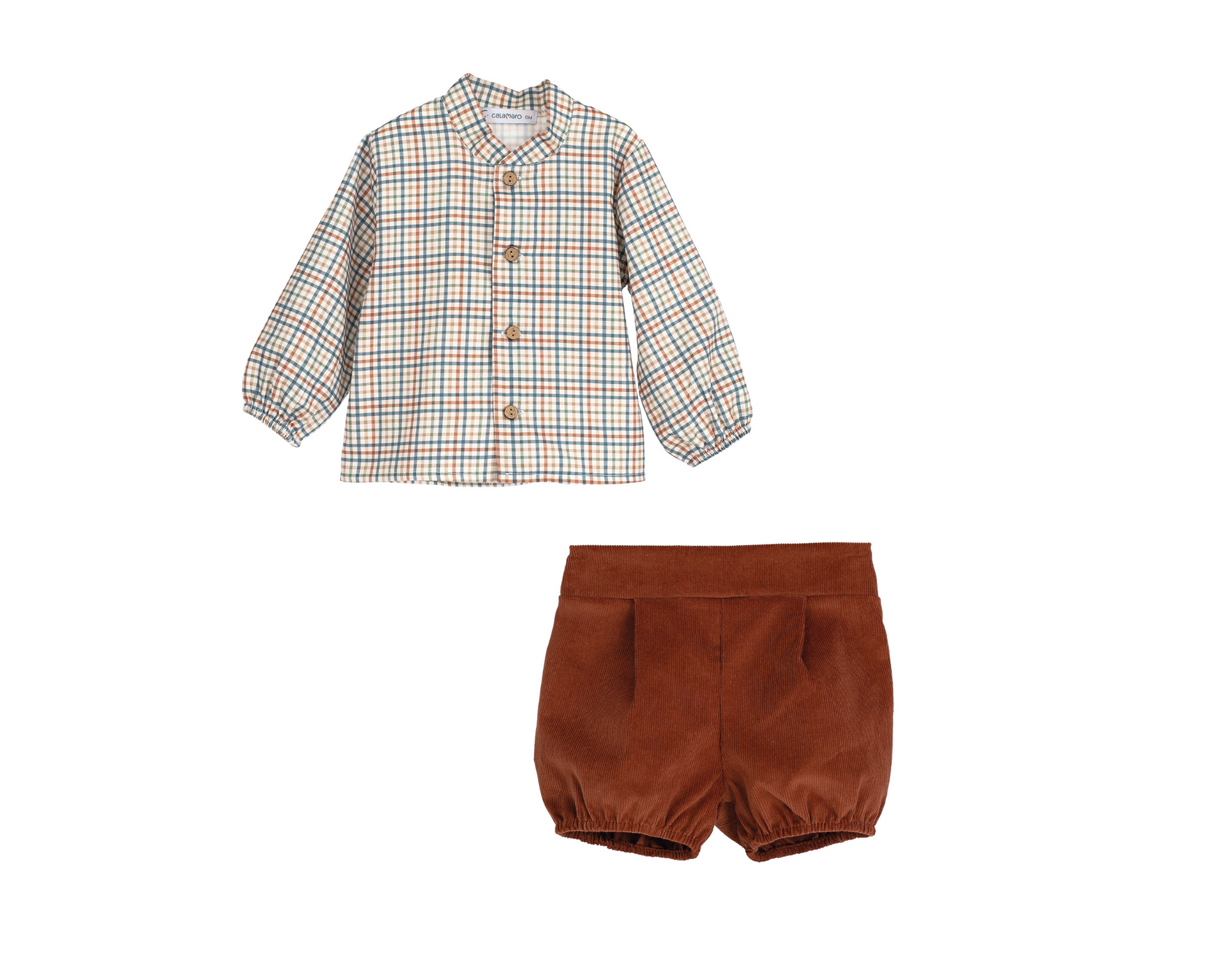 El Conjunto Pantalón Chamsin de Calamaro es una opción elegante y cómoda para vestir a tu niño en cualquier ocasión. Está compuesto por una camisa estampada de corte clásico y un pantalón corto a juego, confeccionado en 100% algodón, ideal para la piel sensible de los más pequeños.