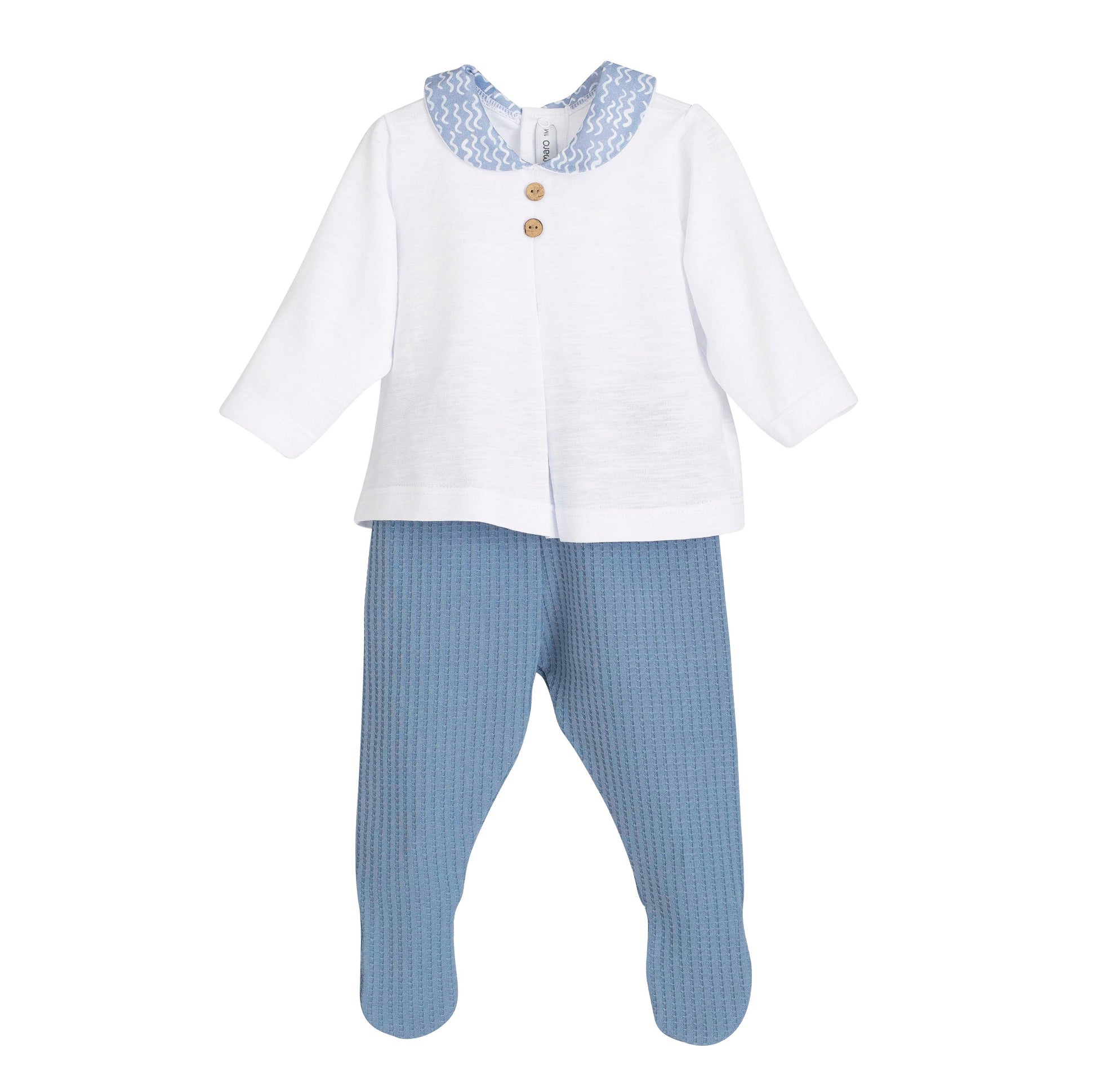 Está formado por camiseta de manga larga en color blanco con delicado cuello estampado a juego y polaina en tono celeste con textura, creando un conjunto armonioso y muy confortable. Confeccionado con tejidos suaves y agradables al tacto, cuida la piel sensible del recién nacido y garantiza libertad de movimiento.