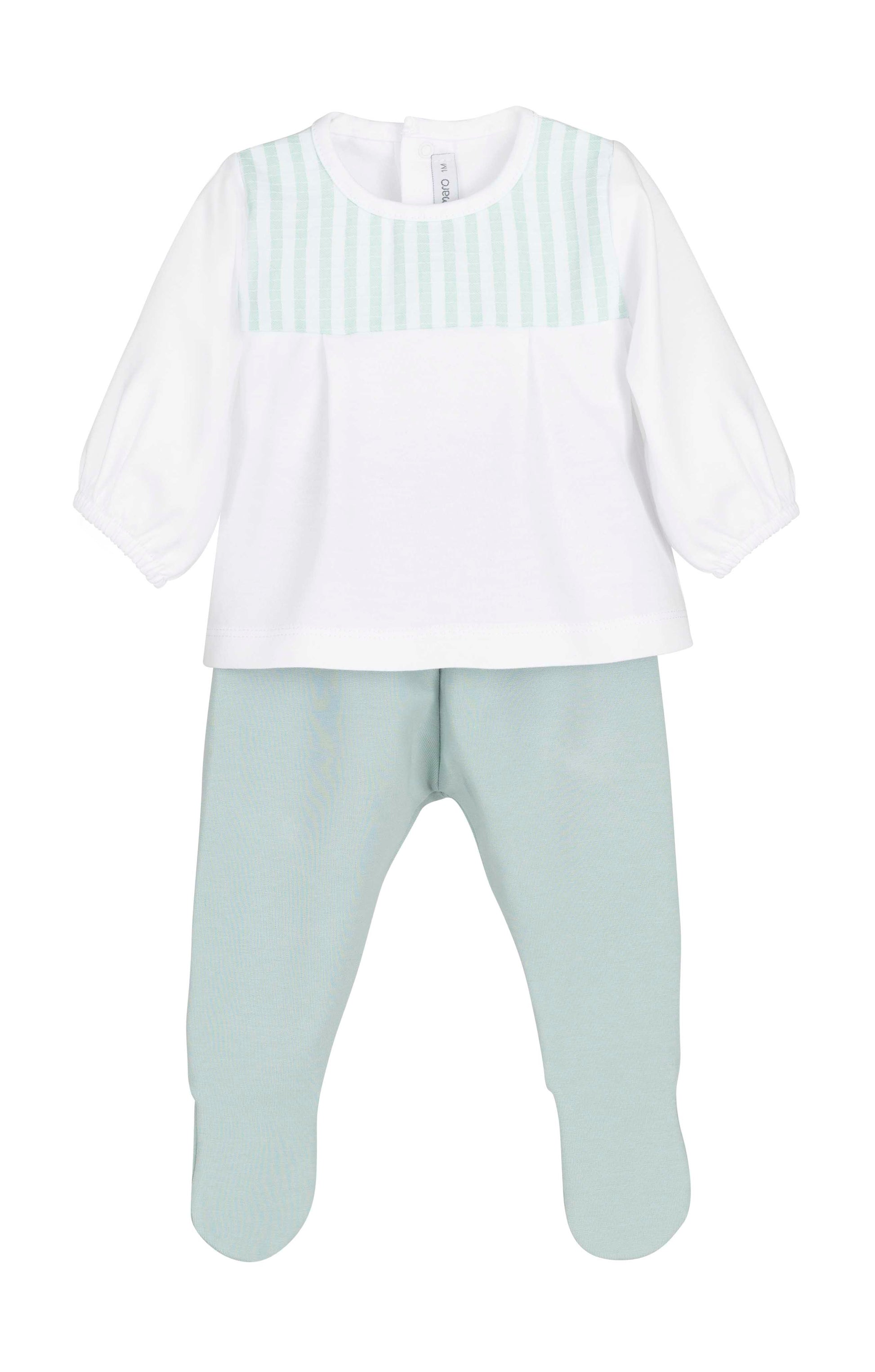 La parte superior en color blanco incorpora un detalle de rayas en tono mint en el canesú, aportando un toque elegante y coordinado con la polaina lisa. El pantalón tipo polaina garantiza abrigo y confort, manteniendo al bebé protegido en todo momento.