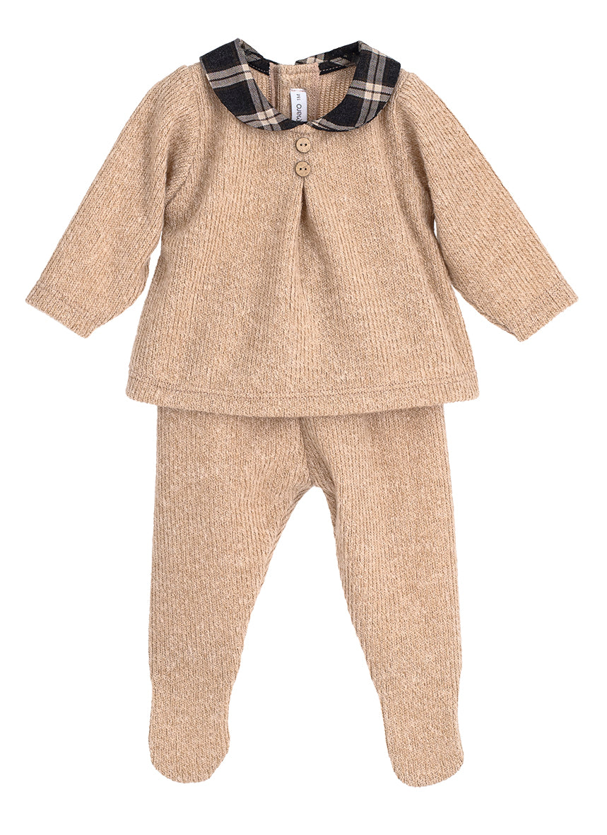Conjunto de primera puesta para niño recién nacido de la colección Tramontana de Calamaro. Incluye jersey de tacto aterciopelado con cuello americano, ideal para facilitar el cambio y brindar máximo confort. Acompañado de una polaina a juego, este conjunto es perfecto para los primeros días de vida.