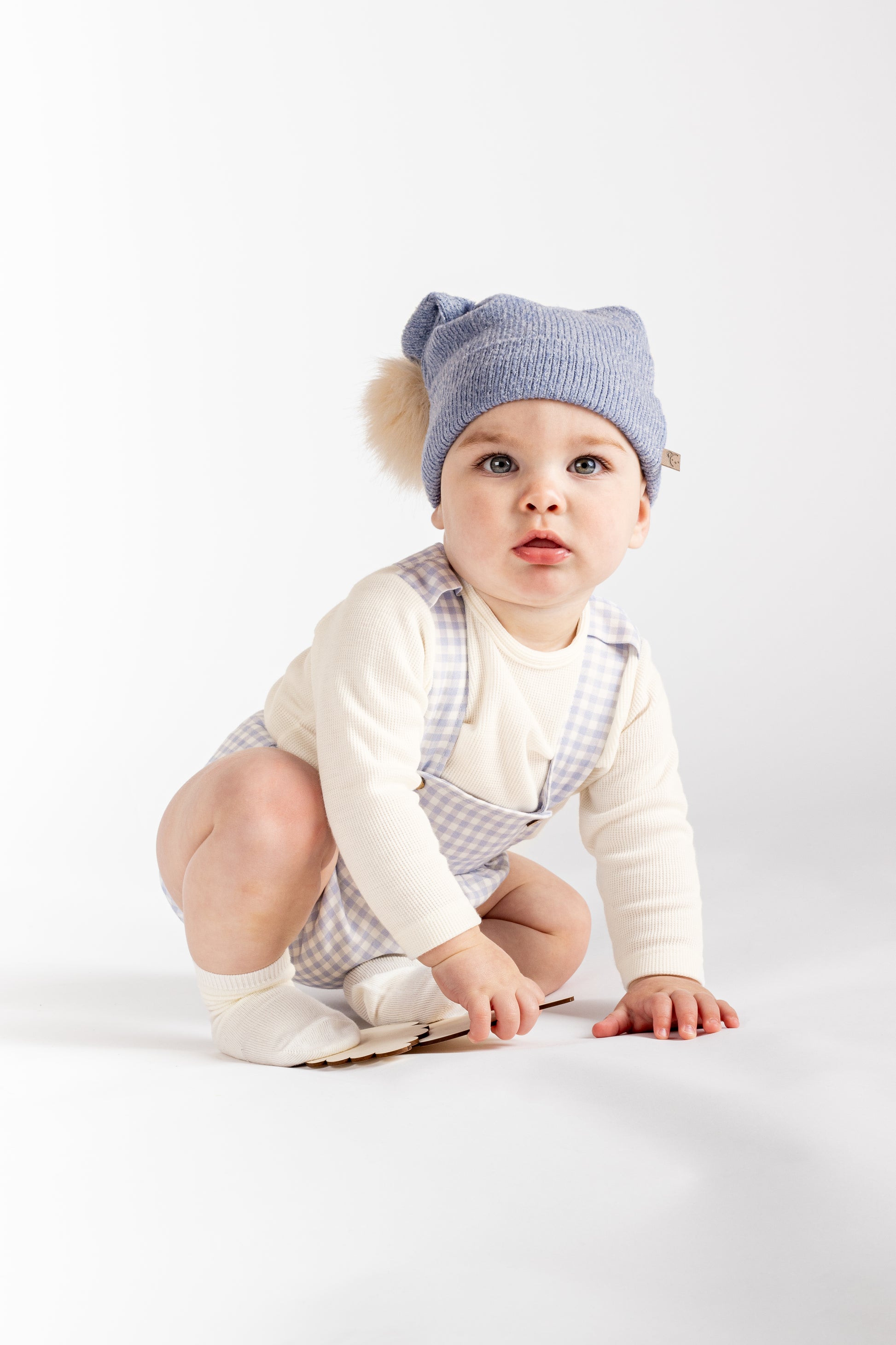 Incluye un peto en cuadro vichy azul con tirantes y una camiseta de manga larga a juego, confeccionada en tejidos suaves y agradables para la piel delicada del bebé.