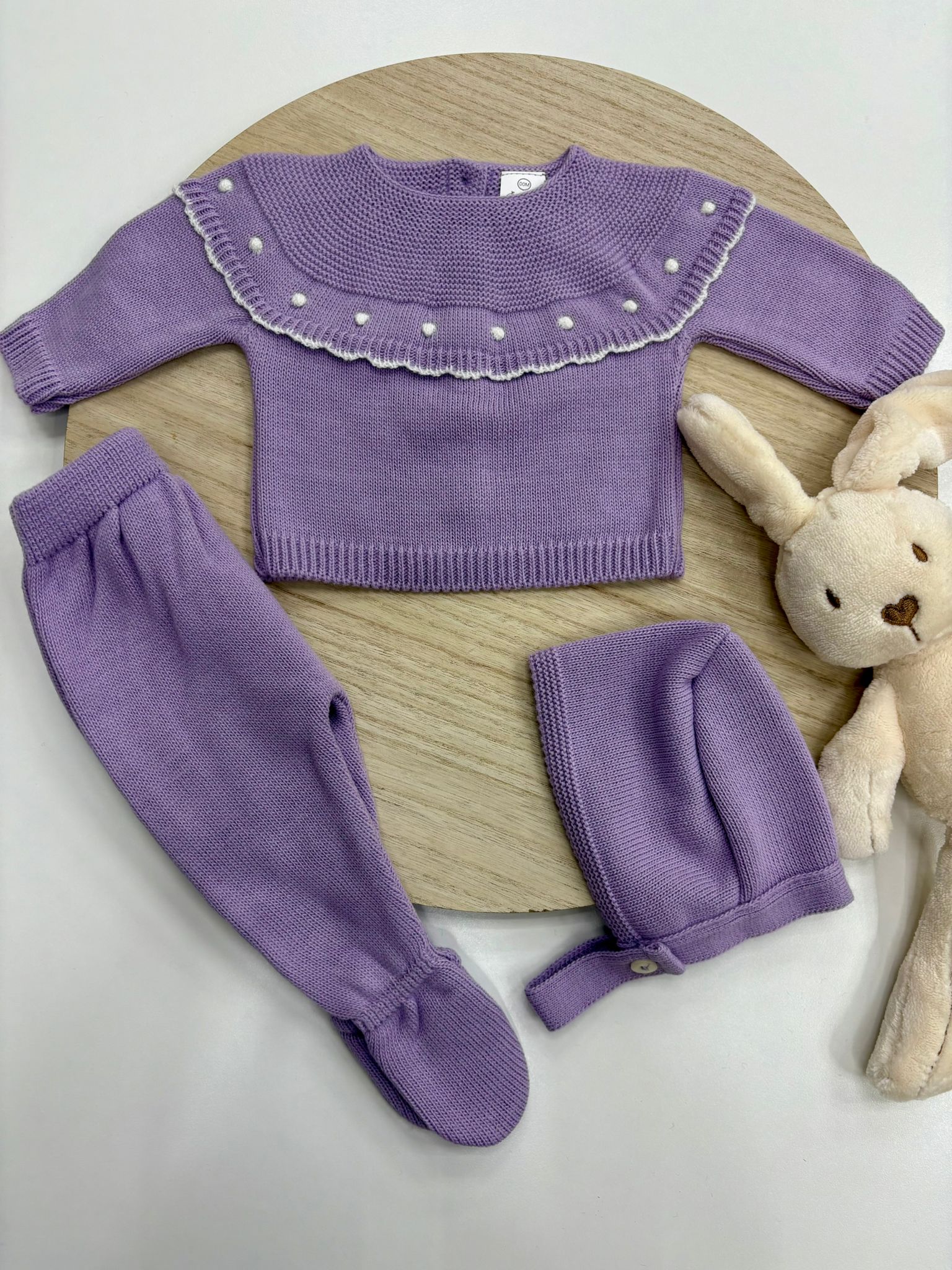 Conjunto primera puesta bebé 3 piezas lila con cuello volante y topitos marfil – 00 prematuro a 6 meses