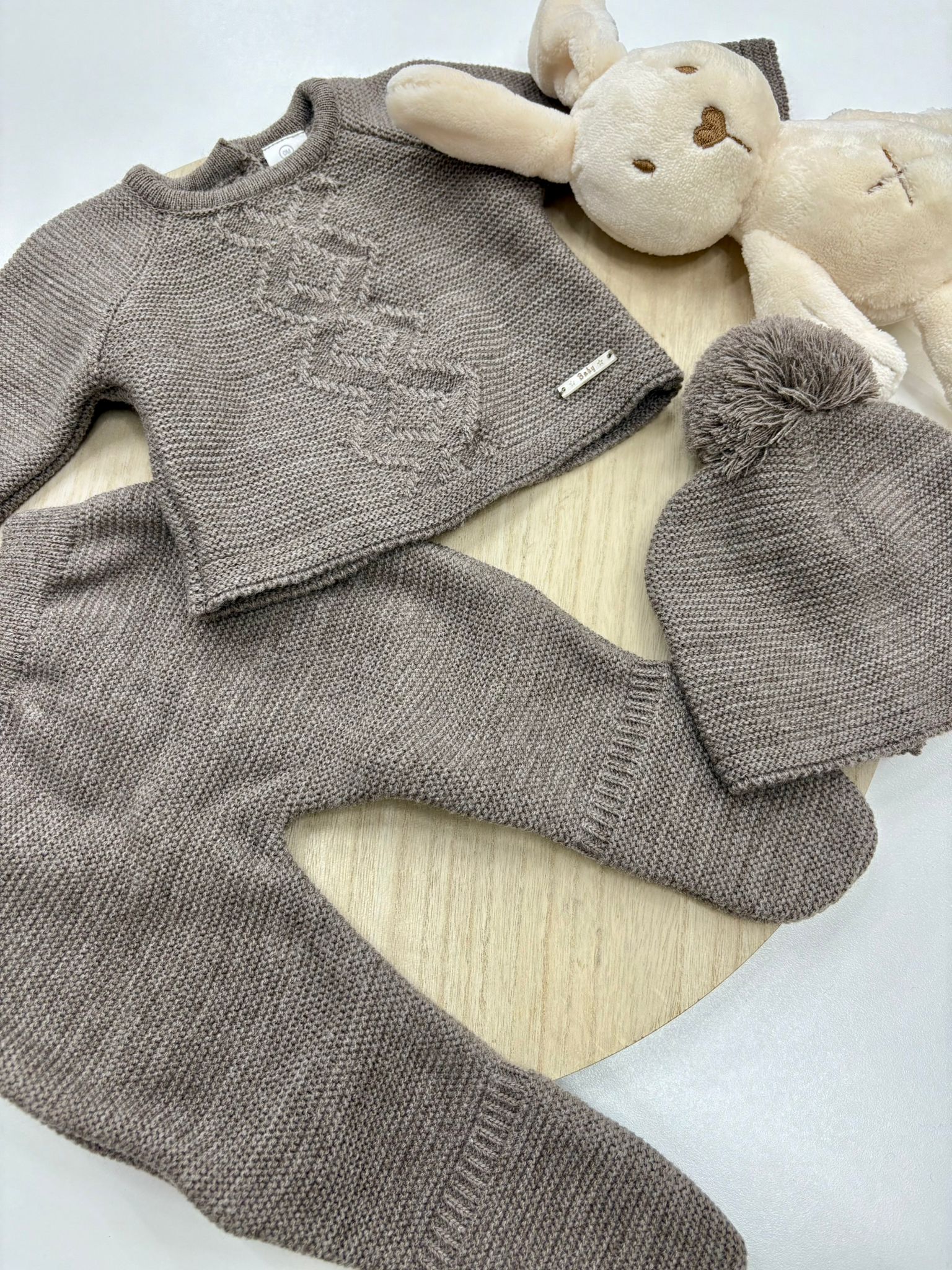 Los primeros días de tu bebé merecen ternura, calidez y estilo delicado. Este elegante conjunto de primera puesta de 3 piezas en color topo, confeccionado en suave lana acrílica, cuida la piel sensible del recién nacido desde la talla 00 prematuro hasta los 6 meses.