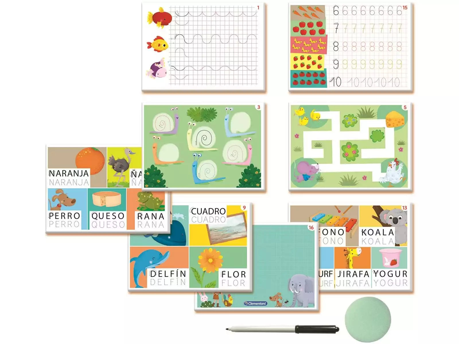 Incluye 8 pizarras con 16 actividades, todas en castellano, que guían al niño paso a paso en la escritura de trazos, letras, palabras y ejercicios visuales. Fabricado en Italia, este set educativo combina calidad con un enfoque pedagógico probado.