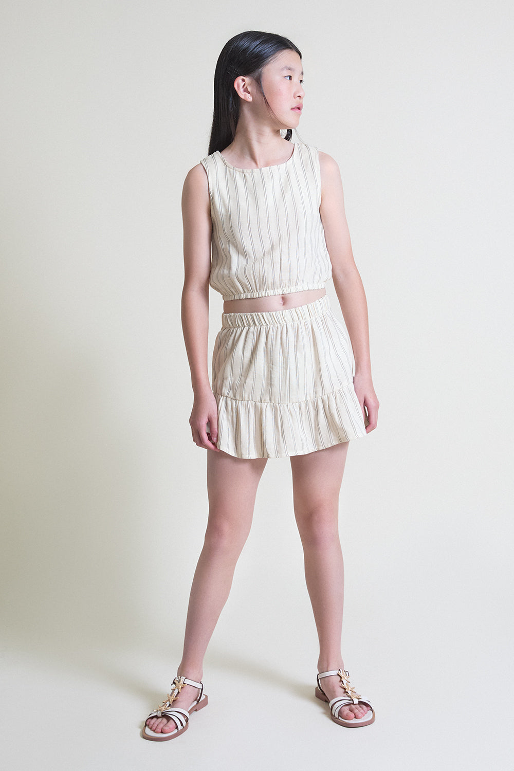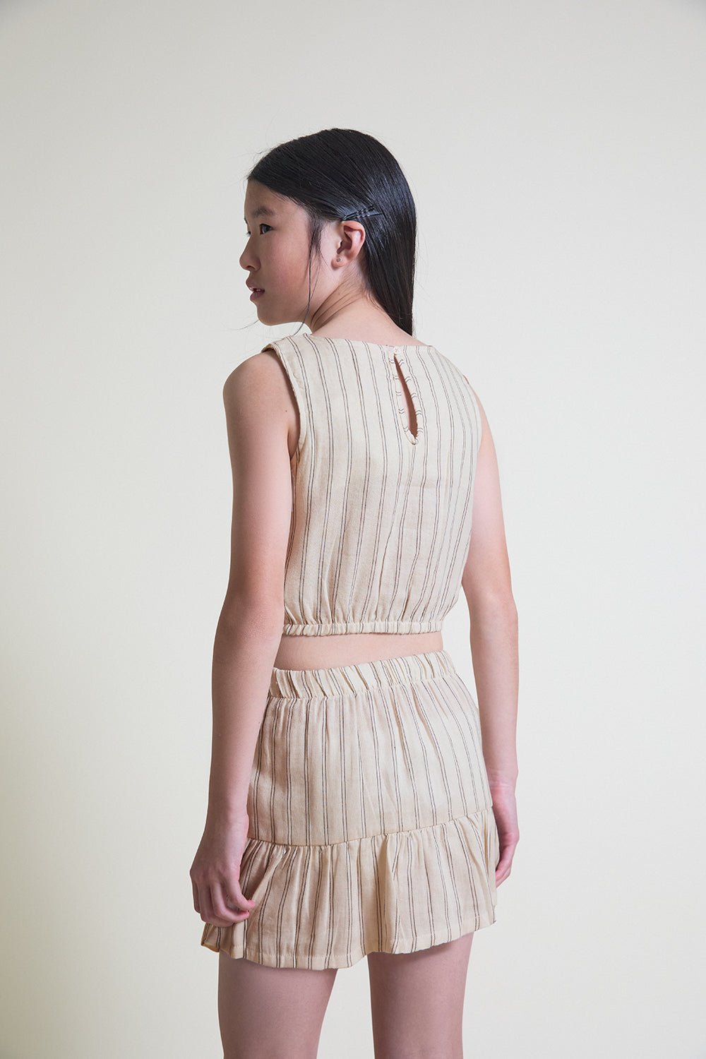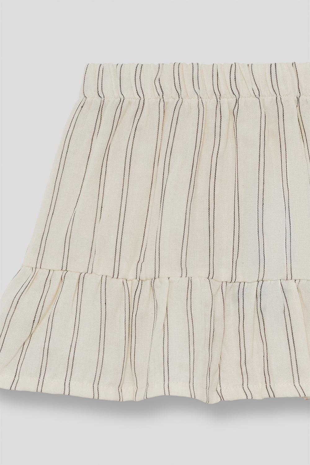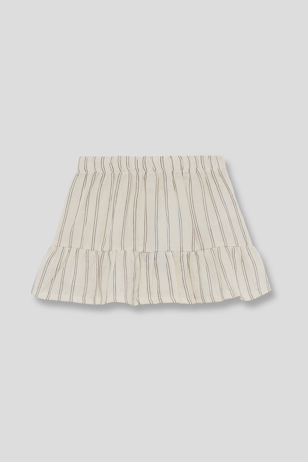 Falda de niña confeccionada en tejido ligero y fresco, ideal para los días más cálidos del verano. Presenta un diseño de rayas finas en tono beige, con cinturilla elástica que se adapta cómodamente a la cintura y un volante inferior que aporta movimiento y un aire delicado.