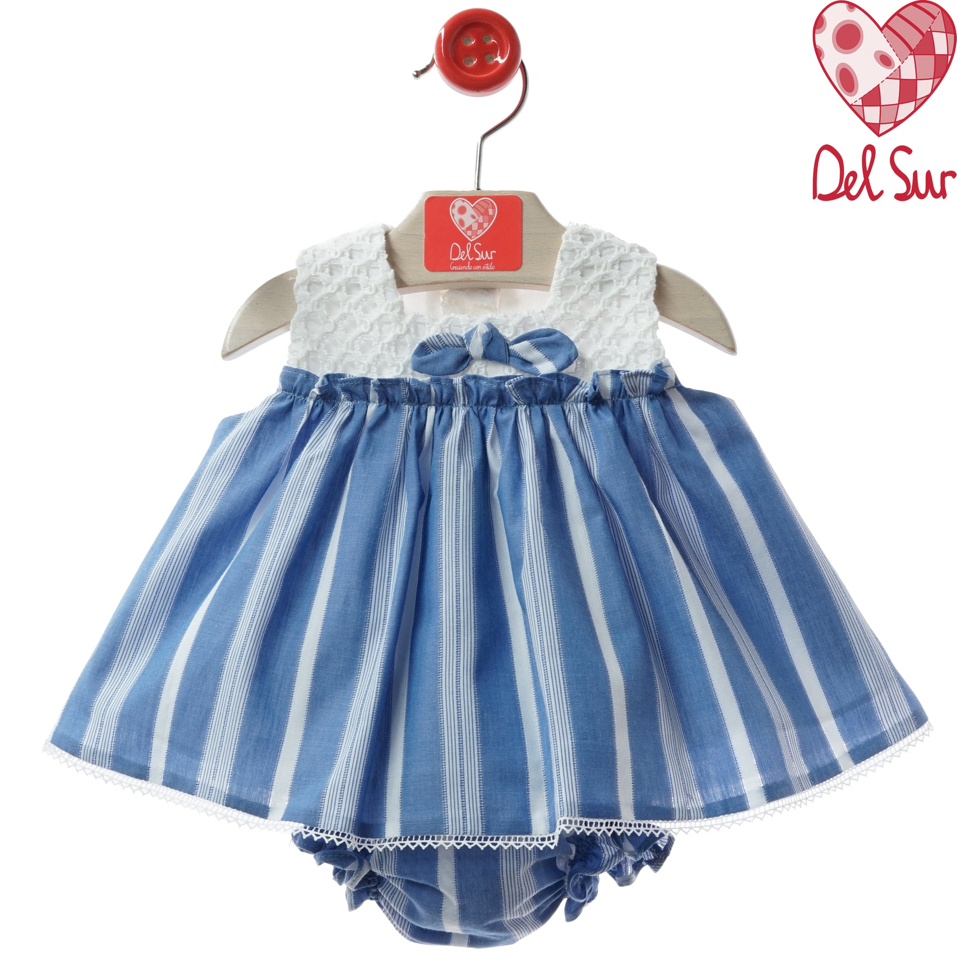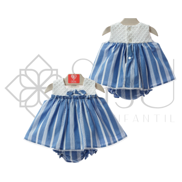 Su diseño combina un delicado cuerpo blanco con textura y una falda con bonitas rayas en tono azul, creando un conjunto clásico y muy favorecedor. El pequeño lazo delantero aporta un detalle dulce que completa el look.