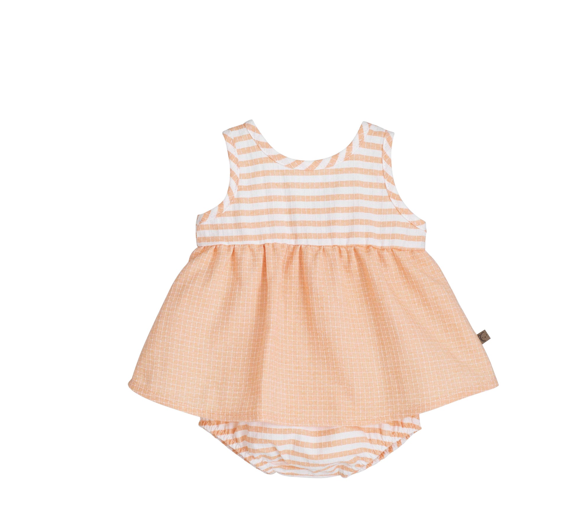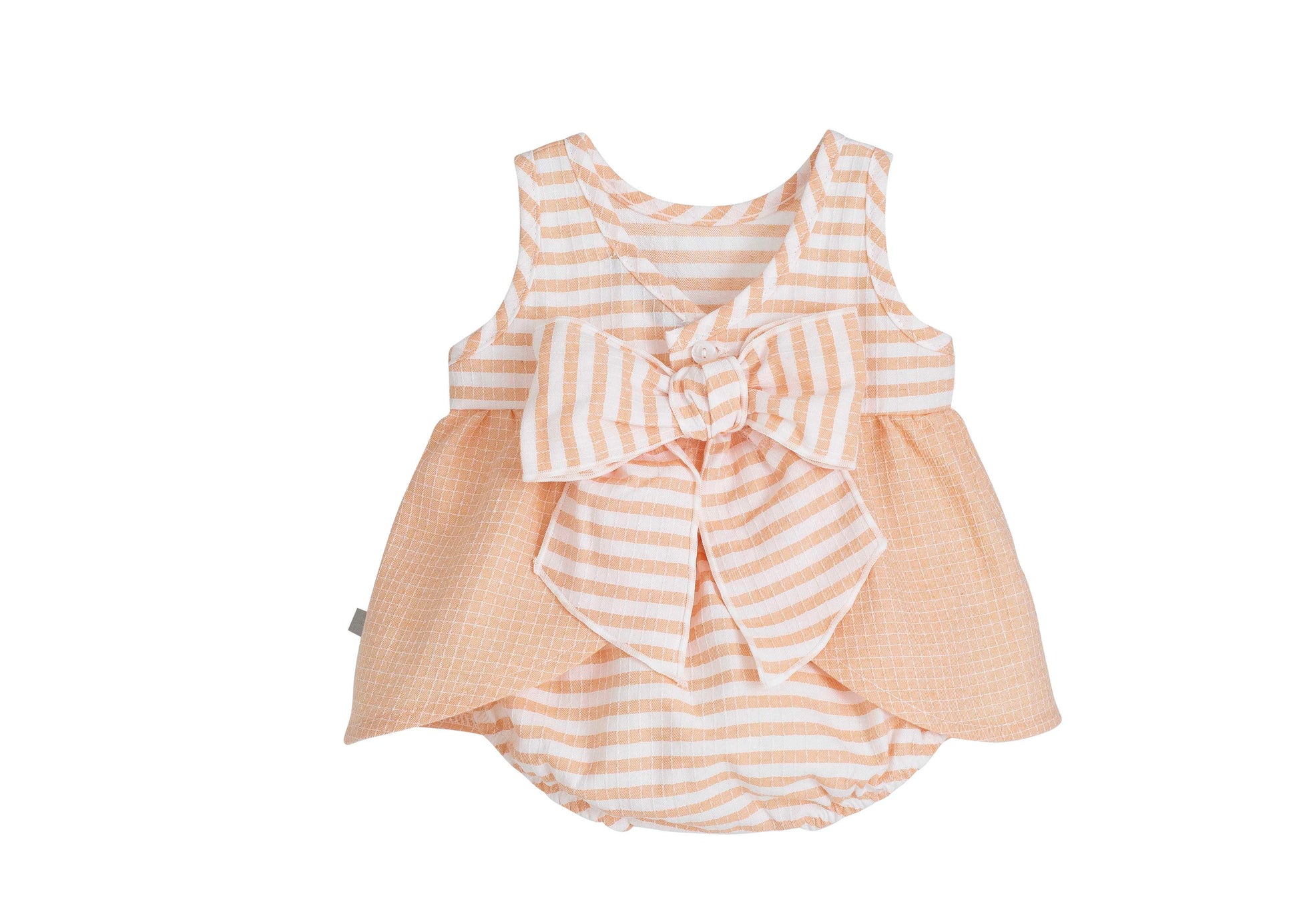 Jesusito de la familia Delhi de Calamaro, un conjunto ideal para bebé que combina dulzura y comodidad en cada detalle. Confeccionado en un delicado tejido en tonos melocotón con mezcla de rayas y cuadritos, destaca por su diseño cuidado y su estilo fresco, perfecto para los meses más cálidos.