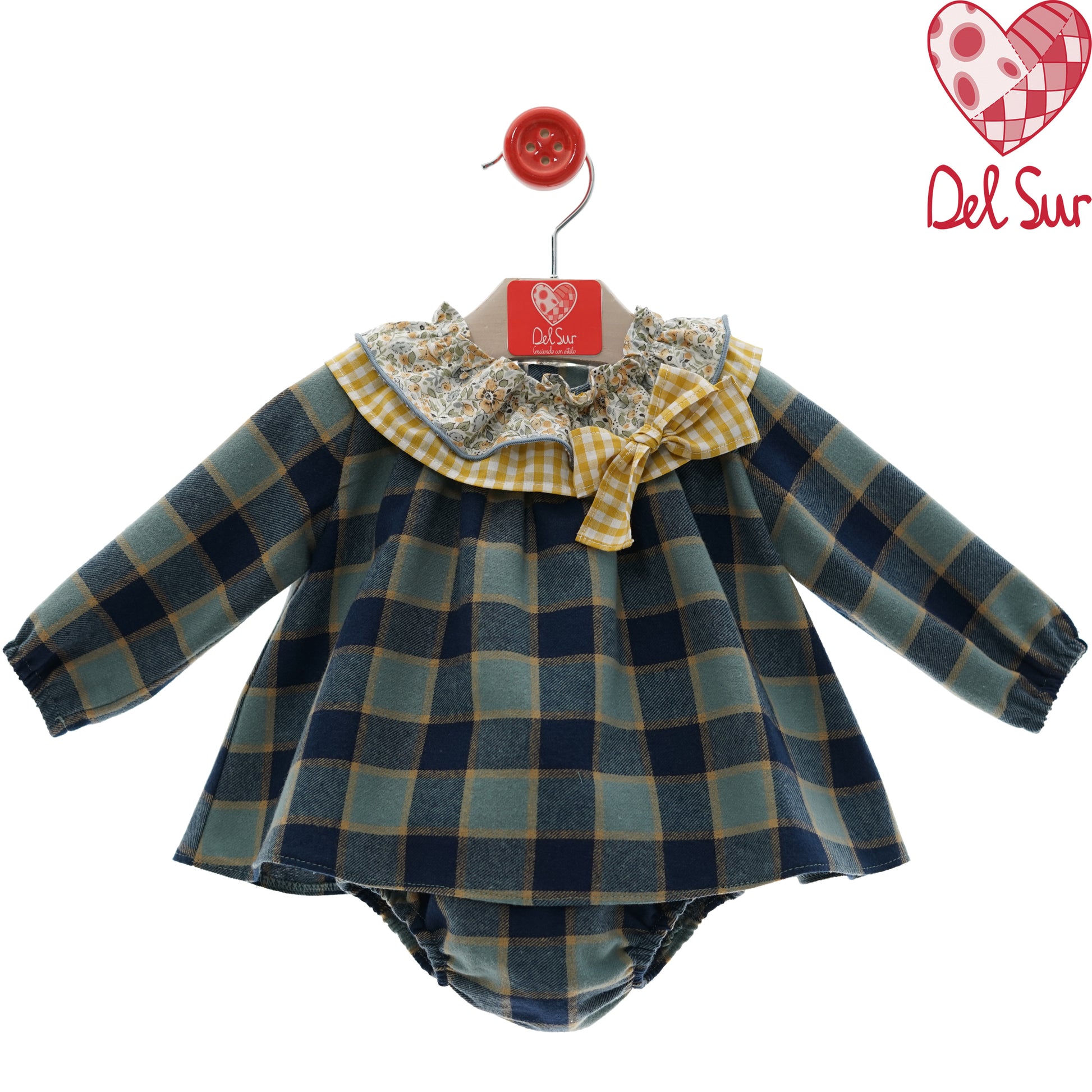 Dulzura y tradición en una sola prenda ✨. Este jesusito de la familia Ganchillo de Del Sur está confeccionado en un tejido de cuadros en tonos azules y mostaza, con un cuello con detalles de estampado floral y lazo vichy amarillo 💛 que le da un toque alegre y especial. Incluye cubrepañal a juego, pensado para que tu peque luzca ideal en cualquier ocasión 🍂👶. Disponible de 1 a 36 meses.