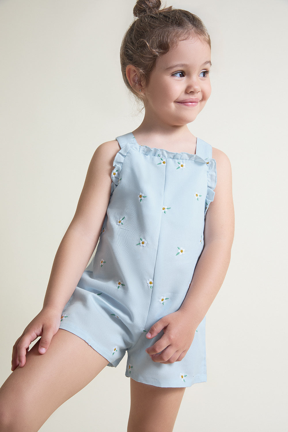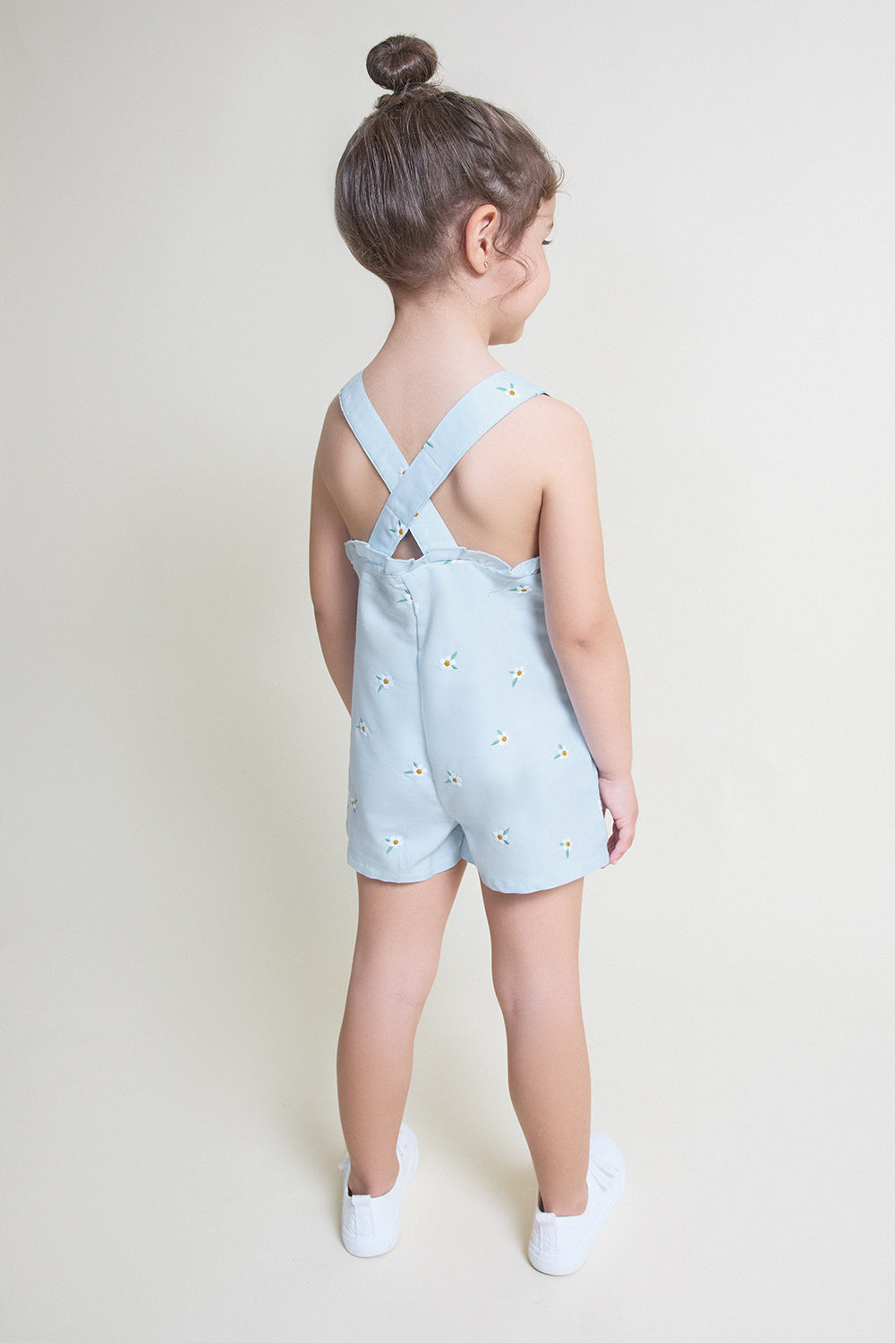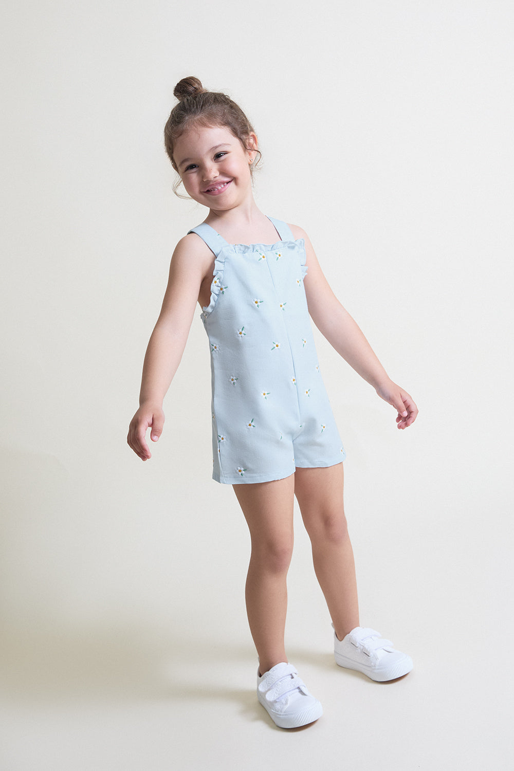 Diseñado con tirantes cruzados en la espalda y volantes en la sisa, ofrece un ajuste cómodo y favorecedor, permitiendo total libertad de movimiento para el día a día. Su corte corto lo convierte en una prenda práctica y ligera, perfecta tanto para paseos como para ocasiones informales.