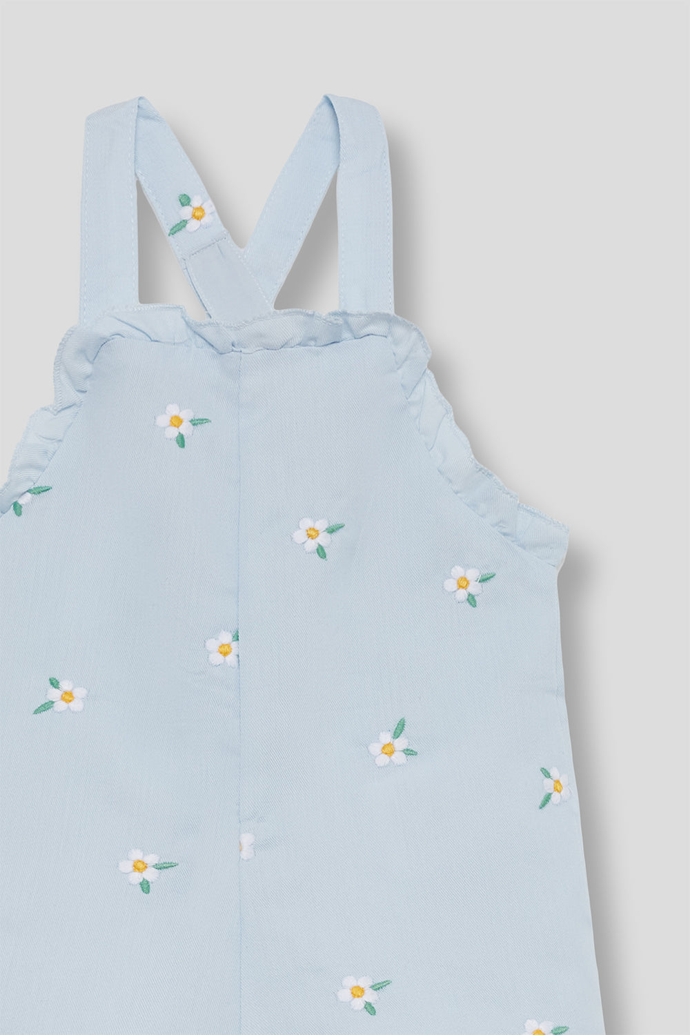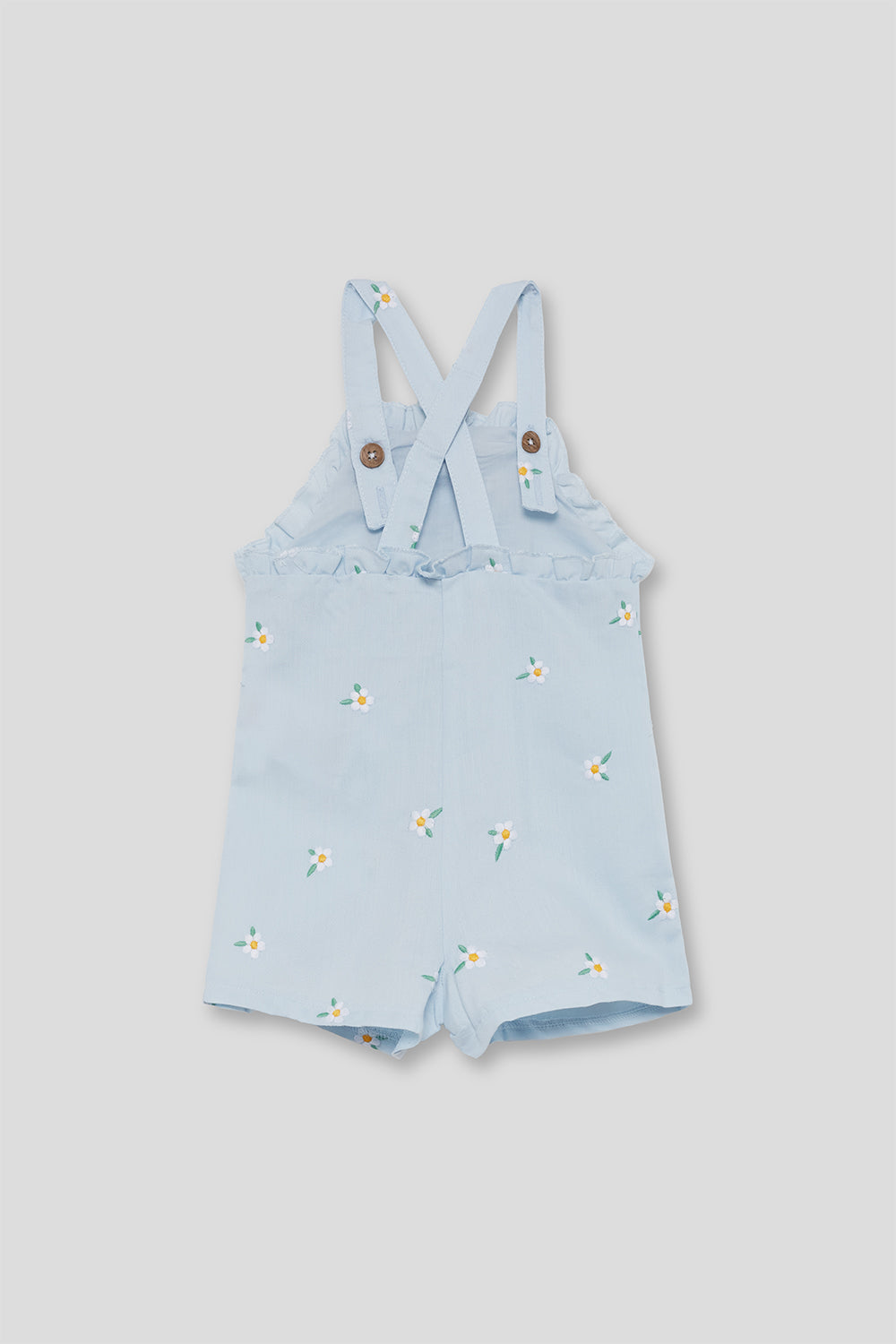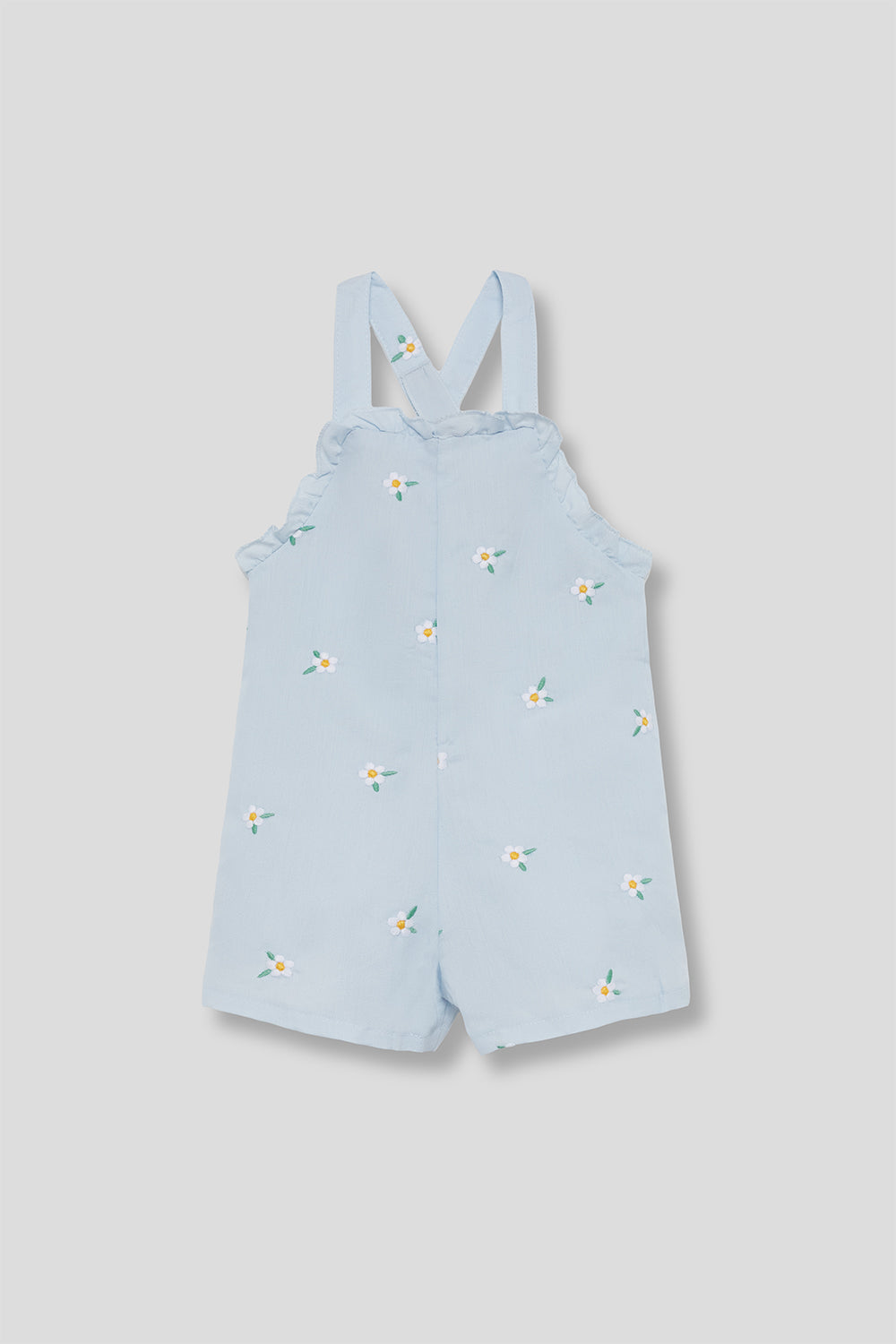 Mono infantil para bebé niña confeccionado en algodón suave y transpirable, ideal para los días más cálidos. Su delicado color azul claro con estampado de pequeñas flores aporta un estilo dulce, fresco y muy veraniego.