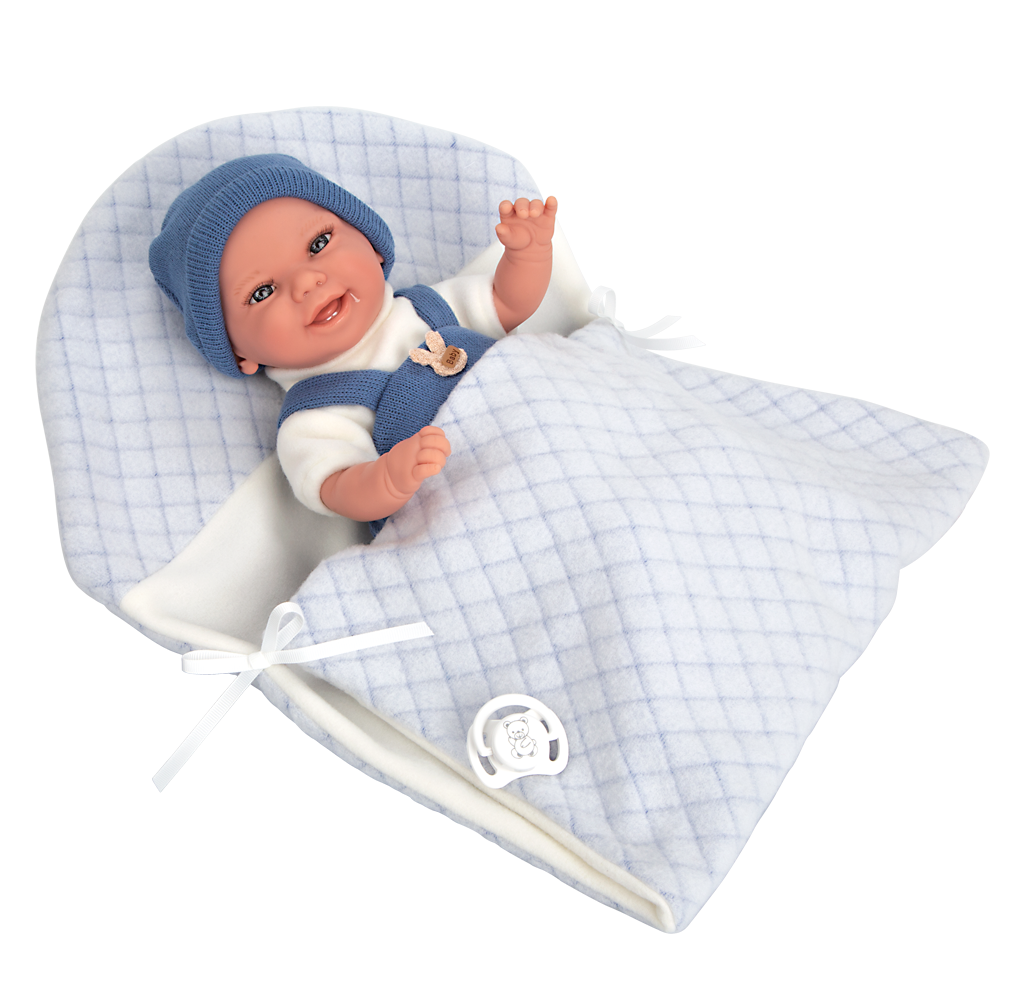 Muñeco ELEGANCE 35 cm BABYTO vestido en tonos azul y blanco, con manta a juego. Su peso es tan real que parece un bebé de verdad. Incluye chupete y manta