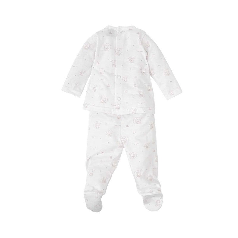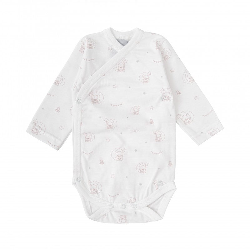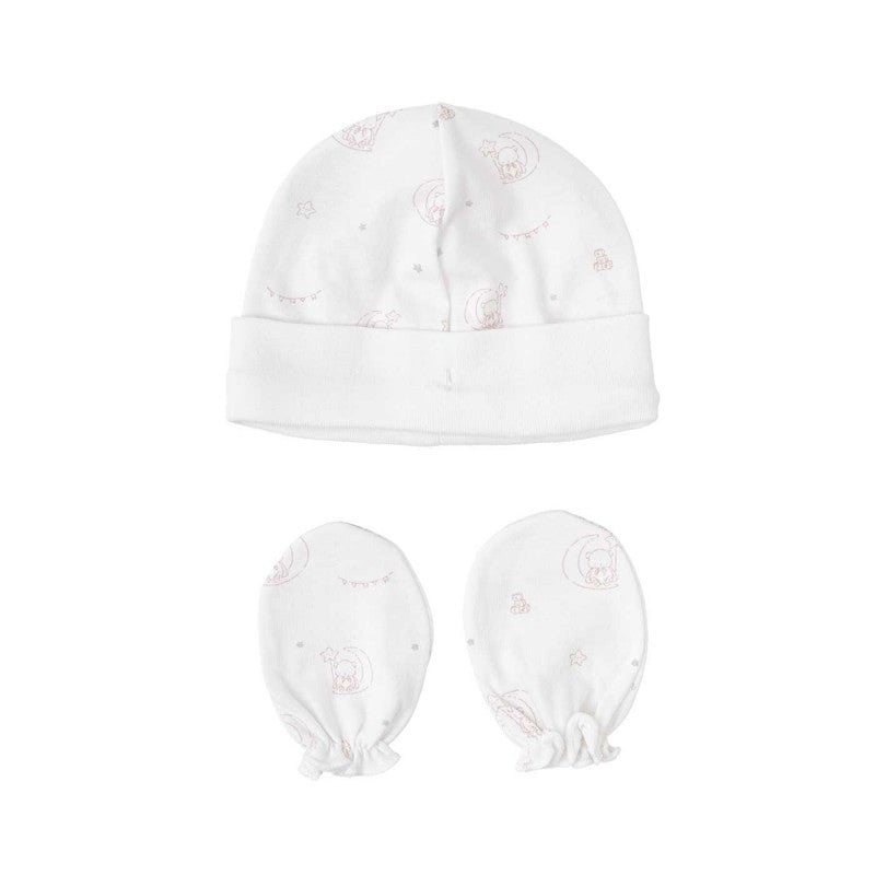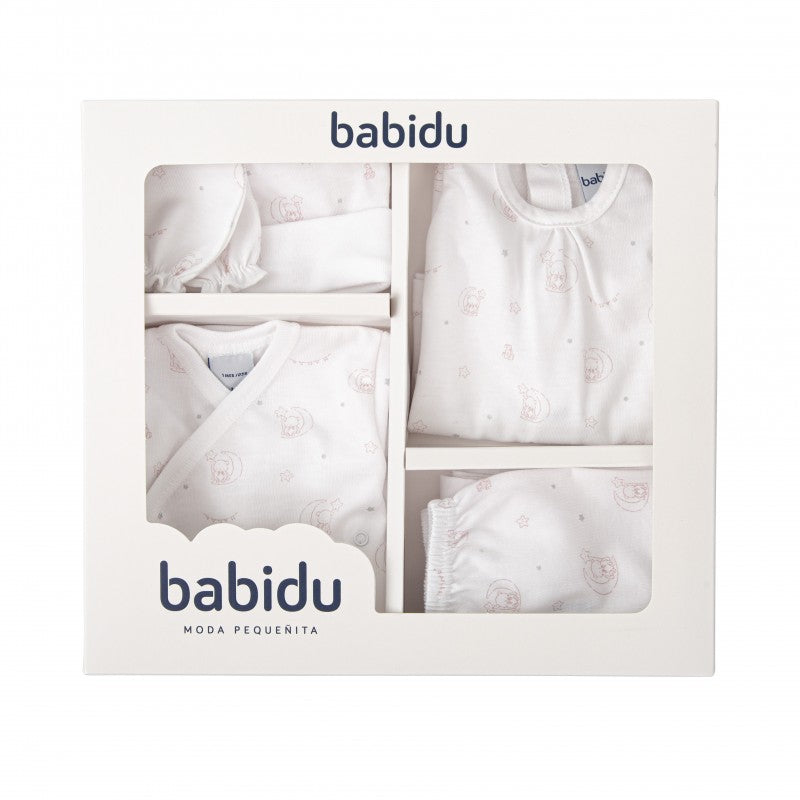 Este set de primera puesta es ideal para dar la bienvenida al recién nacido. Incluye cinco prendas esenciales confeccionadas en suave algodón blanco con delicado estampado rosa de ositos, lunas y estrellas. Presentado en una elegante caja Babidu, es perfecto para regalar.