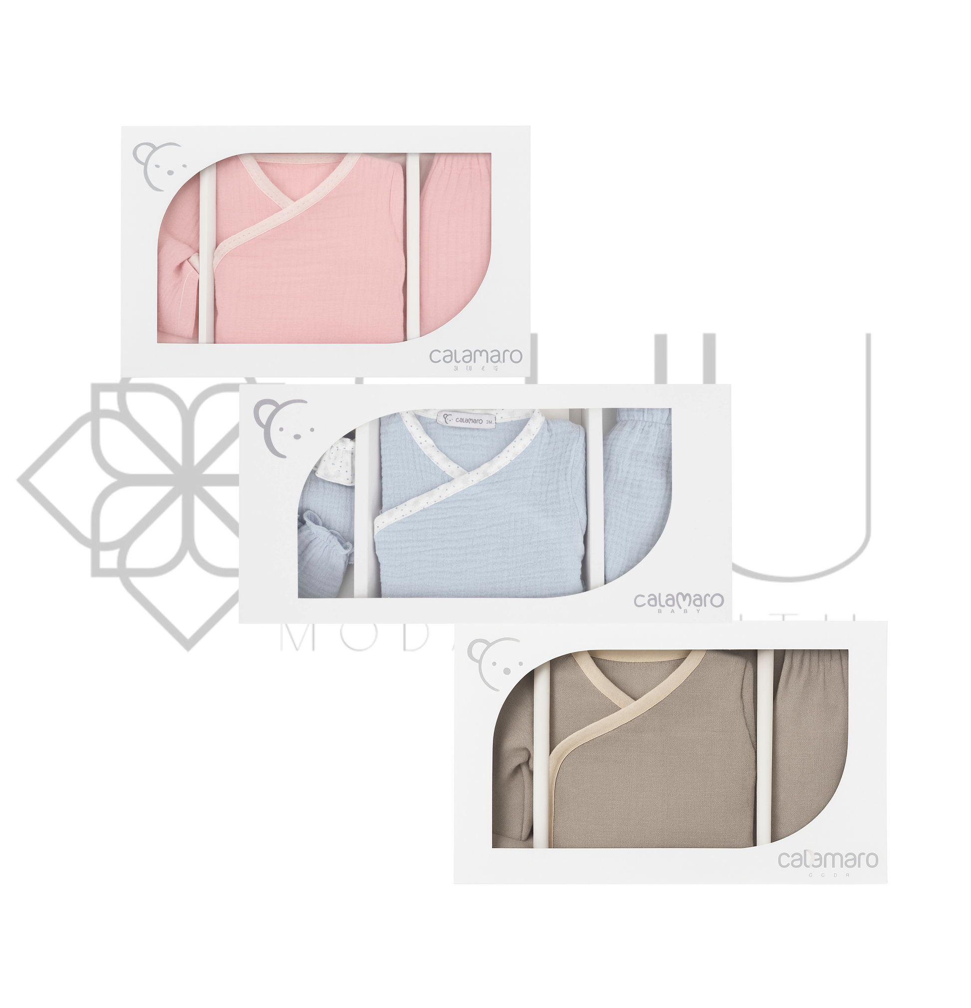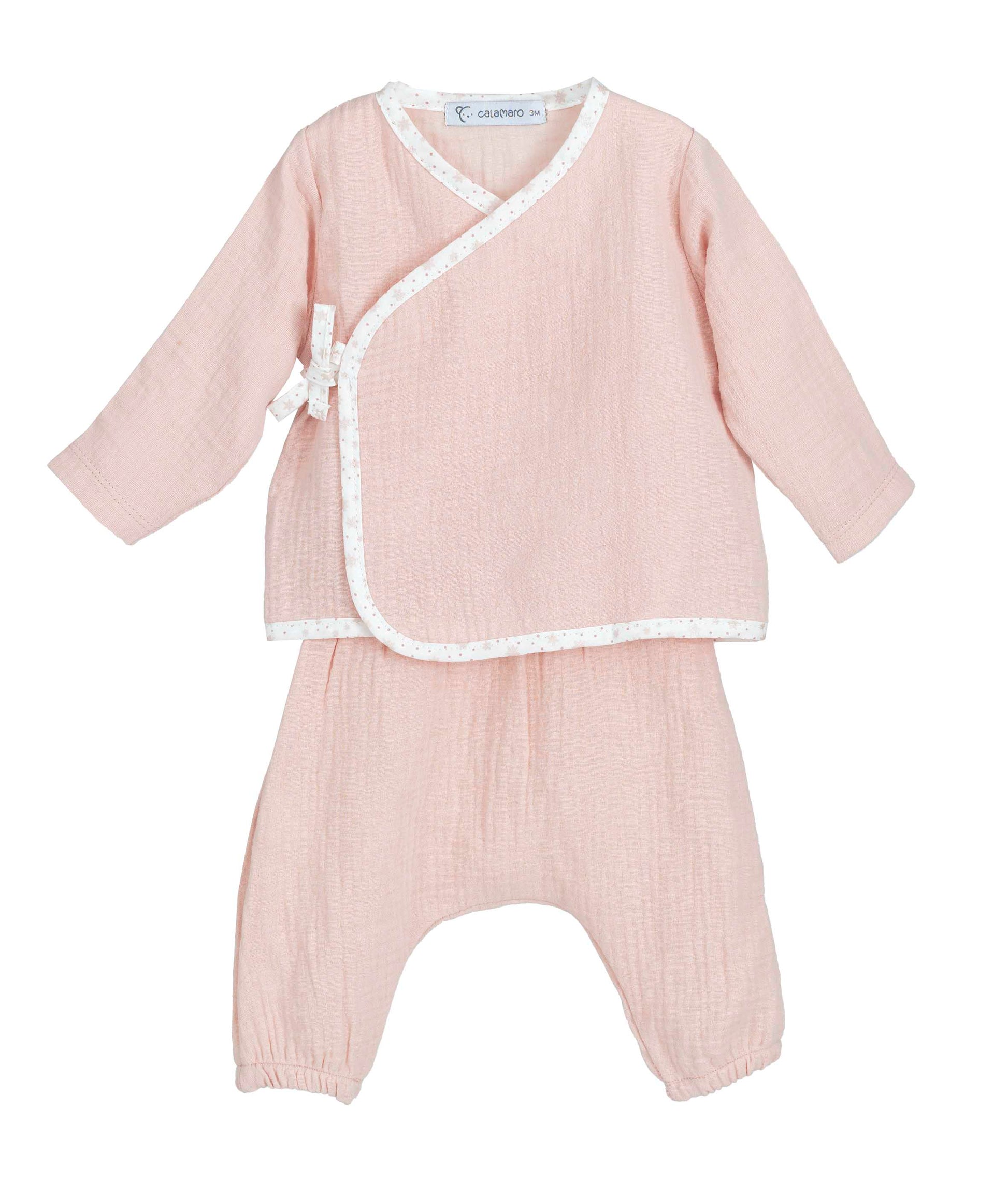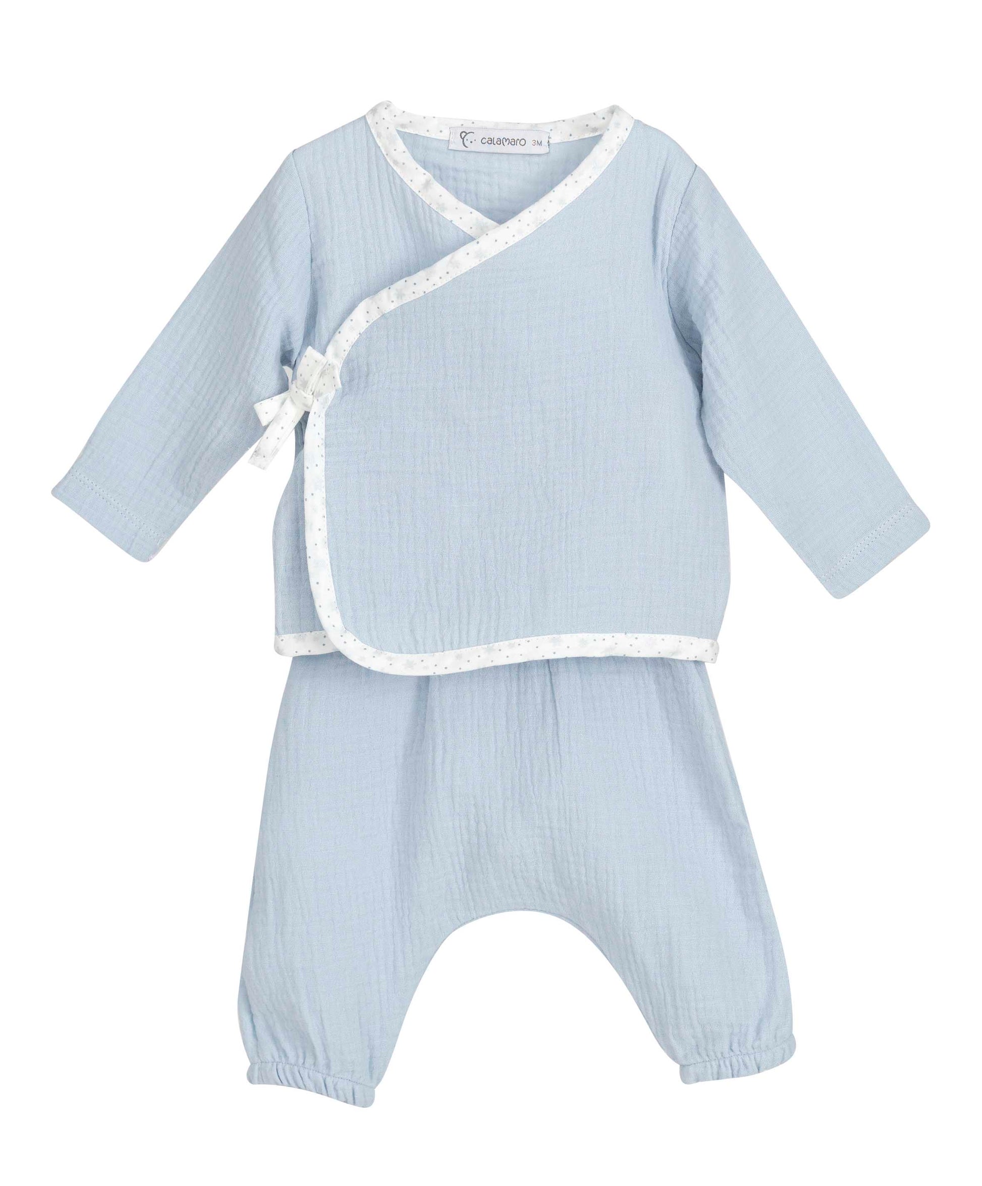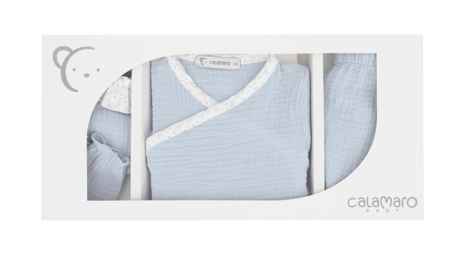 Disponible en tres colores atemporales: rosa, celeste y gris, es un conjunto perfecto tanto para el hospital como para los primeros paseos o como regalo especial.