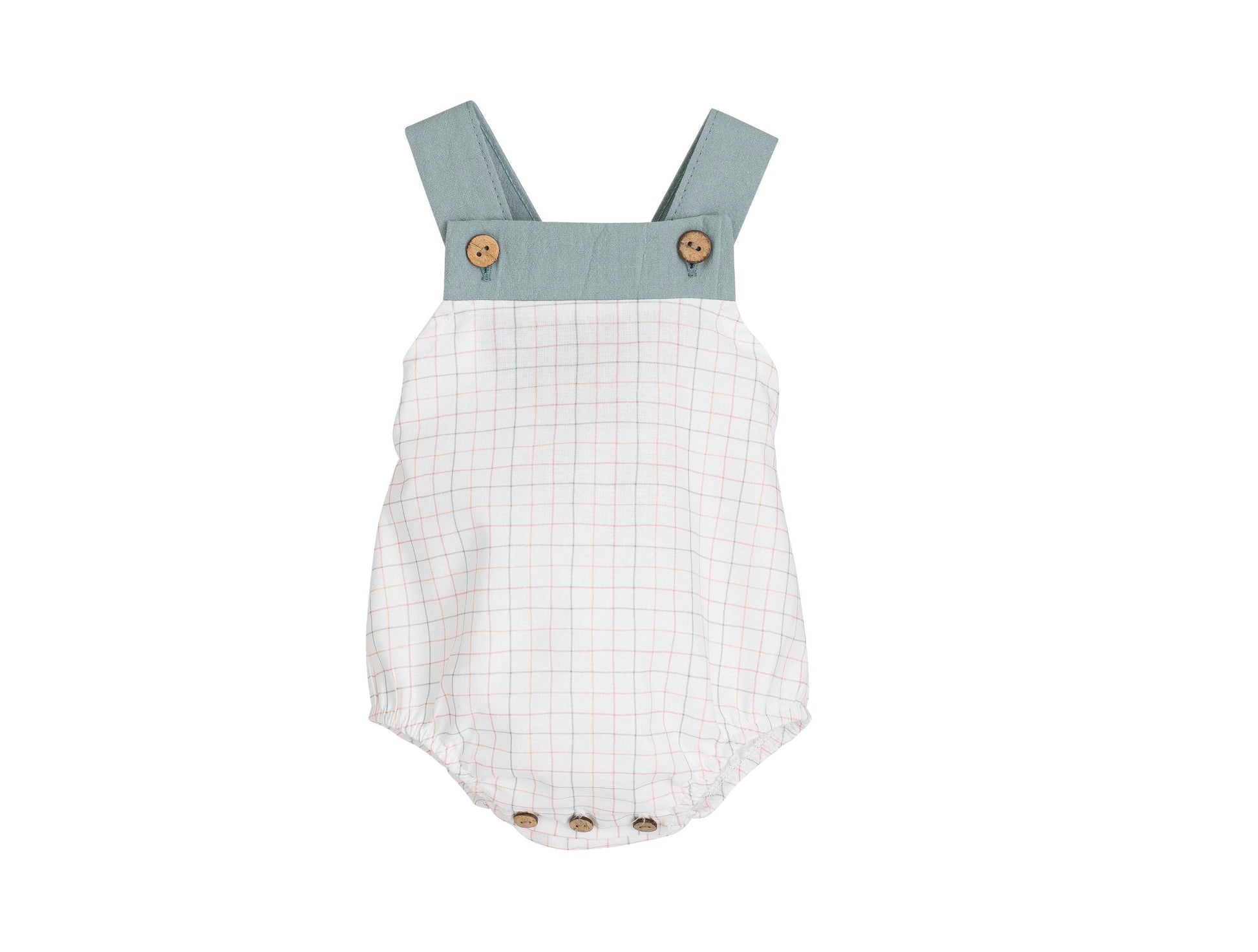 Confeccionado en tejido ligero de cuadros suaves, combina a la perfección con camisetas o camisas fresquitas. Los tirantes en tono verde suave con botones decorativos aportan un toque especial, mientras que el cierre inferior con botones facilita el cambio del pañal.